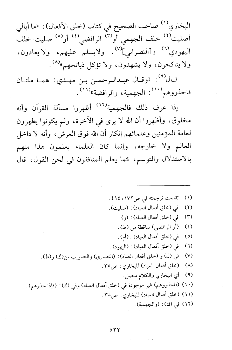 البخاري صاحب الصحيح في كتاب خلق الأفعال ما أبالي أصليت خلف الجهمي أو الرافضي أو صليت خلف اليهودي والنصراني ولايسلم عليهم ولا يعادون ولا يناكحون ولا يشهدون ولا تؤكل ذبائحهم قال وقال عبد الرحمن بن مهدي هما ملتان فاحذروهم الجهمية والرافضة إذا عرف ذلك فالجهمية أظهروا مسألة القرآن وأنه مخلوق وأظهروا أن الله لا يرى في الآخرة ولم يكونوا يظهرون لعامة المؤمنين وعلمائهم إنكار أن الله فوق العرش وأنه لا داخل العالم ولا خارجه وإنما كان العلماء يعلمون هذا منهم بالاستدلال والتوسم كما يعلم المنافقون في لحن القول قال