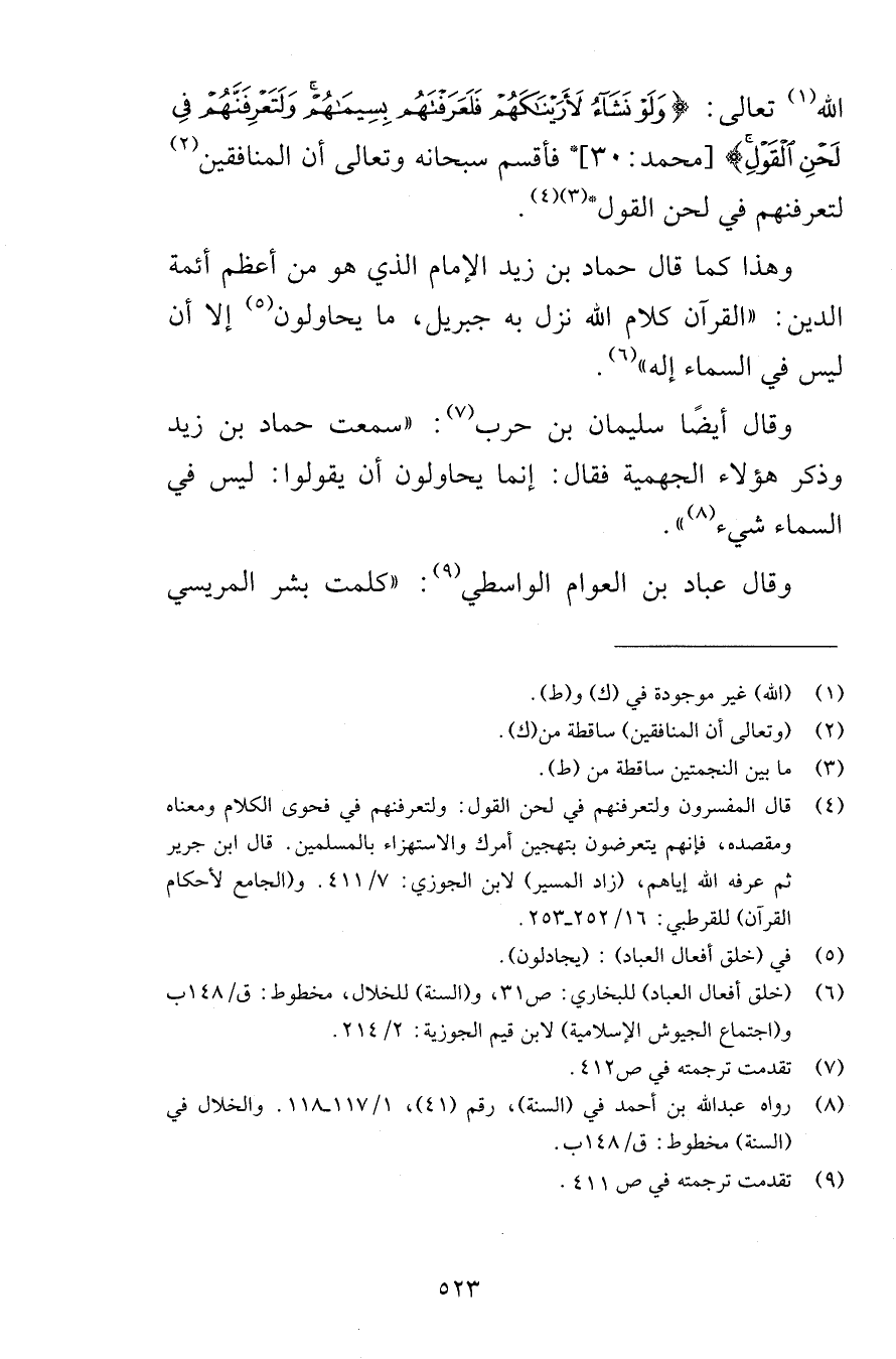 الله تعالى وَلَوْ نَشَاء لَأَرَيْنَاكَهُمْ فَلَعَرَفْتَهُم بِسِيمَاهُمْ وَلَتَعْرِفَنَّهُمْ فِي لَحْنِ الْقَوْلِ [محمد 30] فأقسم سبحانه وتعالى أن المنافقين لتعرفنهم في لحن القول وهذا كما قال حماد بن زيد الإمام الذي هو من أعظم أئمة الدين القرآن كلام الله نزل به جبريل ما يحاولون إلا أن ليس في السماء إله وقال أيضًا سليمان بن حرب سمعت حماد بن زيد وذكر هؤلاء الجهمية فقال إنما يحاولون أن يقولوا ليس في السماء شيء وقال عباد بن العوام الواسطي كلمت بشر المريسي