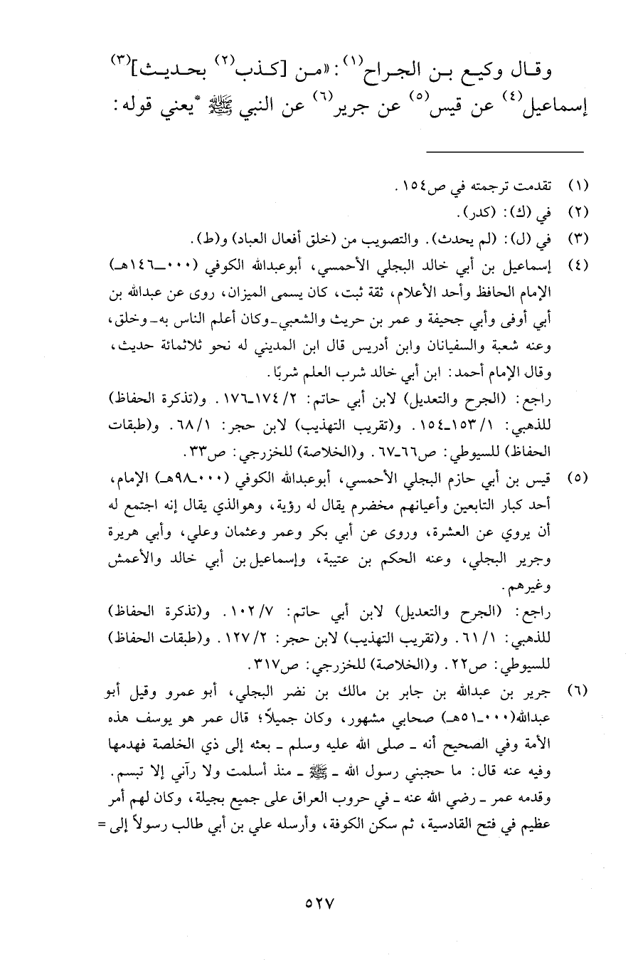 وقال وكيع بن الجراح من كذب بحديث إسماعيل عن قيس عن جرير عن النبي صلى الله عليه وسلم يعني قوله