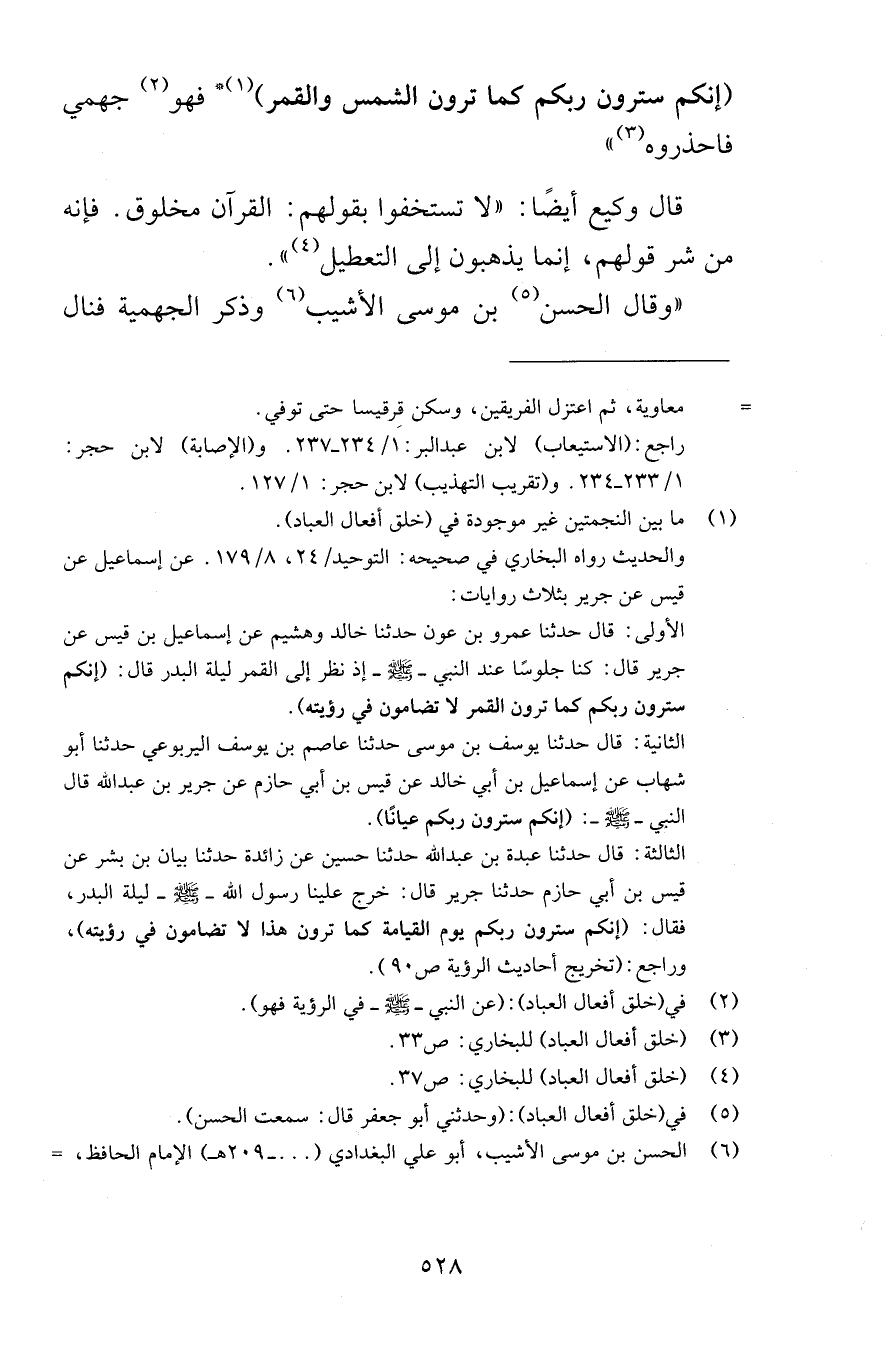 إنكم سترون ربكم كما ترون الشمس والقمر فهو جهمي فاحذروه قال وكيع أيضًا لا تستخفوا بقولهم القرآن مخلوق فإنه من شر قولهم إنما يذهبون إلى التعطيل وقال الحسن بن موسى الأشيب وذكر الجهمية فنال