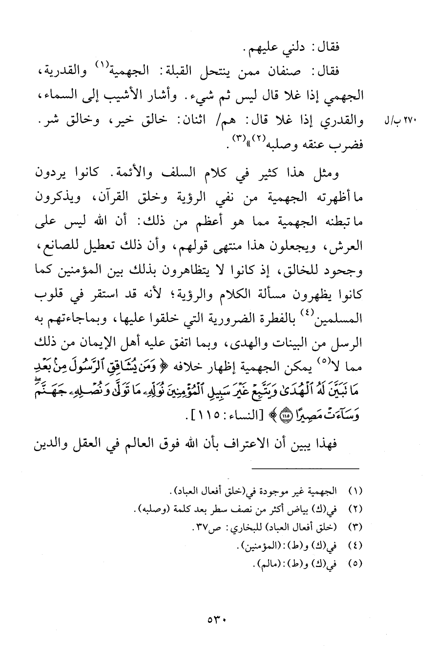فقال دلني عليهم فقال صنفان ممن ينتحل القبلة الجهمية والقدرية الجهمي إذا غلا قال ليس ثم شيء وأشار الأشيب إلى السماء والقدري إذا غلا قال هم اثنان خالق خير وخالق شر فضرب عنقه وصلبه ومثل هذا كثير من كلام السلف والأئمة كانوا يردون ما أظهرته الجهمية من نفي الرؤية وخلق القرآن ويذكرون ما تبطنه الجهمية مما هو أعظم من ذلك أن الله ليس على العرش ويجعلون هذا منتهى قولهم وأن ذلك تعطيل للصانع وجحود للخالق إذ كانوا لا يتظاهرون بذلك بين المؤمنين كما كانوا يظهرون مسألة الكلام والرؤية لأنه قد استقر في قلوب المسلمين بالفطرة الضرورية التي خلقوا عليها وبماجاءتهم به الرسل من البينات والهدى وبما اتفق عليه أهل الإيمان من ذلك مما لا يمكن الجهمية إظهار خلافه وَمَن يُشَاقِقِ الرَّسُولَ مِن بَعْدِ مَا تَبَيَّنَ لَهُ الْهُدَى وَيَتَّبِعْ غَيْرَ سَبِيلِ الْمُؤْمِنِينَ نُوَلِّهِ مَا تَوَلَّى وَنُصْلِهِ جَهَنَّمَ وَسَاءتْ مَصِيراً {115} [النساء 115] فهذا يبين أن الاعتراف بأن الله فوق العالم في العقل والدين