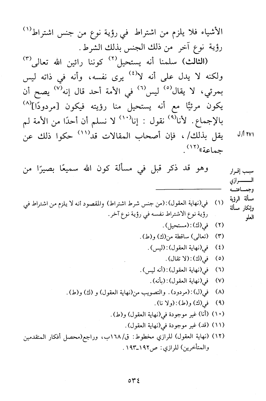 الأشياء فلا يلزم من اشتراط في رؤية نوع من جنس اشتراط رؤية نوع آخر من ذلك الجنس بذلك الشرط الثالث سلمنا أنه يستحيل كوننا رائين الله تعالى ولكنه لا يدل على أنه لا يرى نفسه وأنه في ذاته ليس بمرئي لا يقال ليس في الأمة أحد قال إنه يصح أن يكون مرئيًّا مع أنه يستحيل منا رؤيته فيكون مردودًا بالإجماع لأنا نقول إنا لا نسلم أن أحدًا من الأمة لم يقل بذلك فإن أصحاب المقالات قد حكوا ذلك عن جماعة وهو قد ذكر قبل في مسألة كون الله سميعًا بصيرًا من