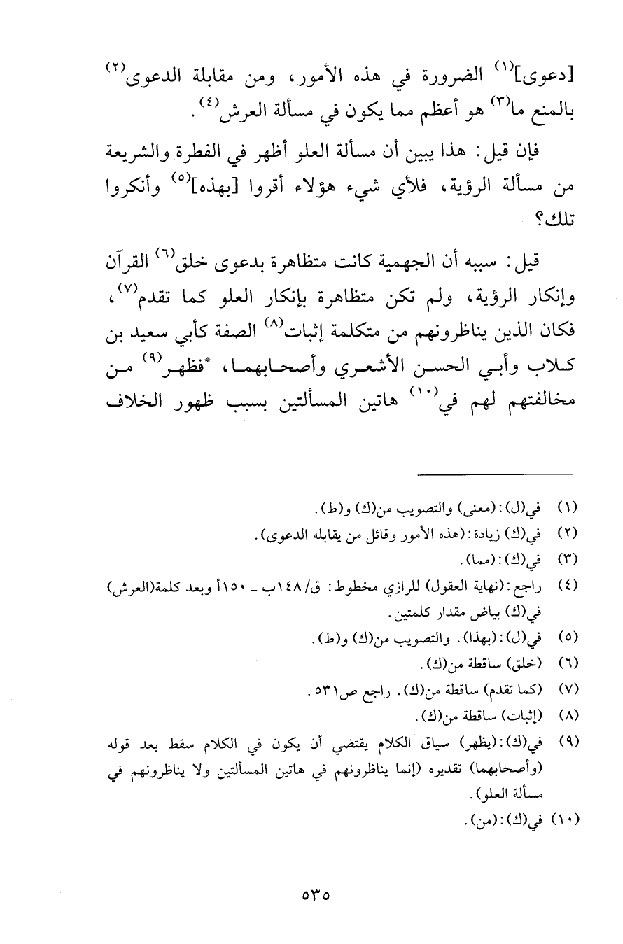 دعوى الضرورة في هذه الأمور ومن مقابلة الدعوى بالمنع ما هو أعظم مما يكون في مسألة العرش فإن قيل هذا يبين أن مسألة العلو أظهر في الفطرة والشريعة من مسألة الرؤية فلأي شيء هؤلاء أقروا بهذه وأنكروا تلك قيل أن سببه أن الجهمية كانت متظاهرة بدعوى خلق القرآن وإنكار الرؤية ولم تكن متظاهرة بإنكار العلو كما تقدم فكان الذين يناظرونهم من متكلمة إثبات الصفة كأبي سعيد بن كلاب وأبي الحسن الأشعري وأصحابهما فظهر من مخالفتهم لهم في هاتين المسألتين بسبب ظهور الخلاف