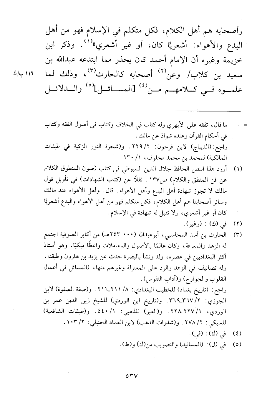 وأصحابه هم أهل الكلام فكل متكلم في الإسلام فهو من أهل البدع والأهواء أشعريًّا كان أو غير أشعري وذكر ابن خزيمة وغيره أن الإمام أحمد كان يحذر مما ابتدعه عبد الله بن سعيد بن كلاب وعن أصحابه كالحارث وذلك لما علموه في كلامهم من المسائل والدلائل
