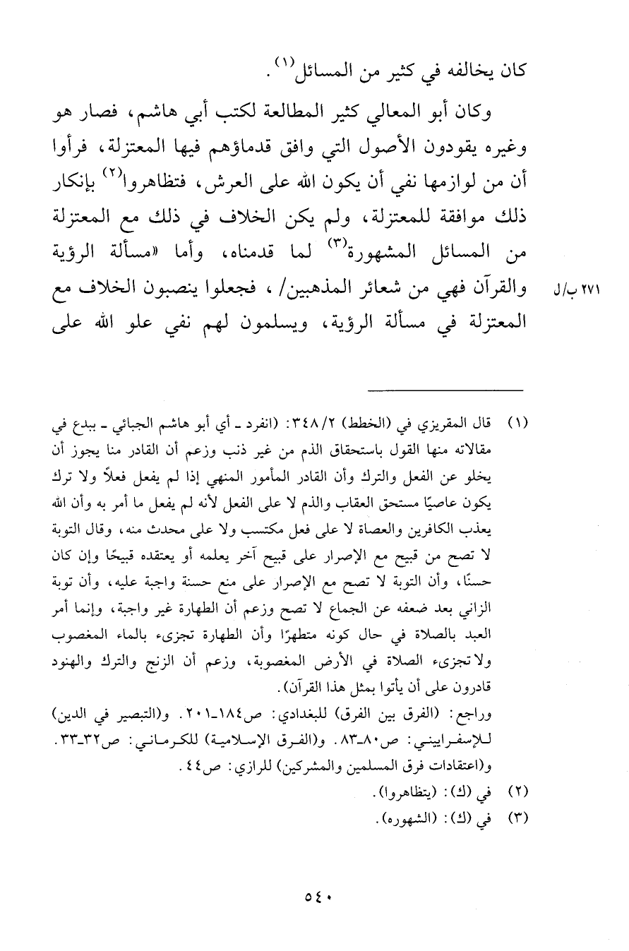 كان يخالفه في كثير من المسائل وكان أبو المعالي كثير المطالعة لكتب أبي هاشم فصار هو وغيره يقودون الأصول التي وافق قدماؤهم فيها المعتزلة فرأوا أن من لوازمها نفي أن يكون الله على العرش فتظاهروا بإنكار ذلك موافقة للمعتزلة ولم يكن الخلاف في ذلك مع المعتزلة من المسائل المشهورة لما قدمناه وأما مسألة الرؤية والقرآن فهي من شعائر المذهبين فجعلوا ينصبون الخلاف مع المعتزلة في مسألة الرؤية ويسلمون لهم نفي علو الله على