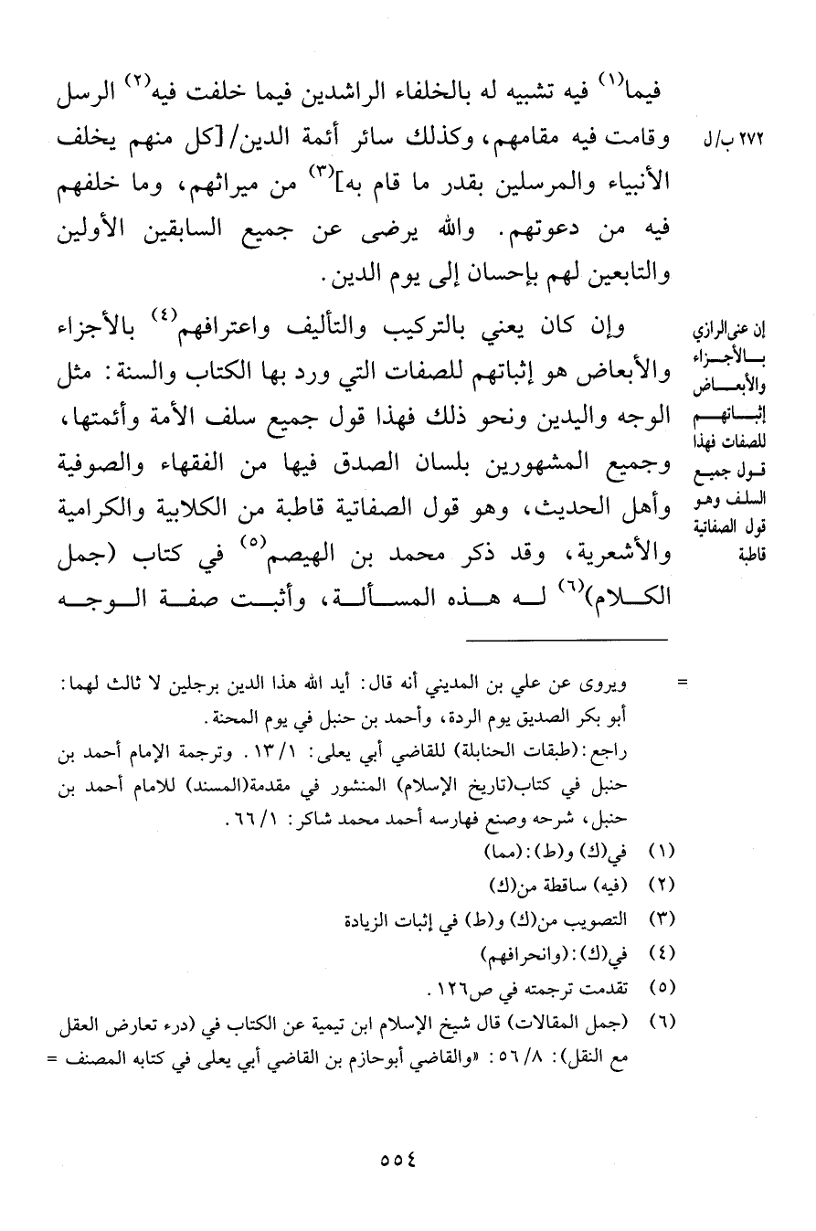 فيما فيه تشبيه له بالخلفاء الراشدين فيما خلفت فيه الرسل وقامت فيه مقامهم وكذلك سائر أئمة الدين كل منهم يخلف الأنبياء والمرسلين بقدر ما قام به من ميراثهم وما خلفهم فيه من دعوتهم والله يرضى عن جميع السابقين الأولين والتابعين لهم بإحسان إلى يوم الدين وإن كان يعني بالتركيب والتأليف واعترافهم بالأجزاء والأبعاض هو إثباتهم للصفات التي ورد بها الكتاب والسنة مثل الوجه واليدين ونحو ذلك فهذا قول جميع سلف الأمة وأئمتها وجميع المشهورين بلسان الصدق فيها من الفقهاء والصوفية وأهل الحديث وهو قول الصفاتية قاطبة من الكلابية والكرامية والأشعرية وقد ذكر محمد بن الهيصم في كتاب جمل الكلام له هذه المسألة وأثبت صفة الوجه