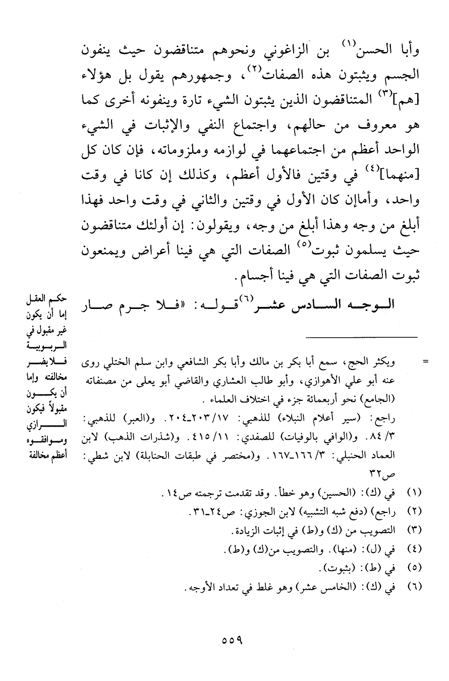 وأبا الحسن بن الزاغوني ونحوهم متناقضون حيث ينفون الجسم ويثبتون هذه الصفات وجمهورهم يقول بل هؤلاء هم المتناقضون الذين يثبتون الشيء تارة وينفونه أخرى كما هو معروف من حالهم واجتماع النفي والإثبات في الشيء الواحد أعظم من اجتماعهما في لوازمه وملزوماته فإن كان كل منهما في وقتين فالأول أعظم وكذلك إن كانا في وقت واحد وأماإن كان الأول في وقتين والثاني في وقت واحد فهذا أبلغ من وجه وهذا أبلغ من وجه ويقولون إن أولئك متناقضون حيث يسلمون ثبوت الصفات التي هي فينا أعراض ويمنعون ثبوت الصفات التي هي فينا أجسام الوجه السادس عشر قوله فلا جرم صار