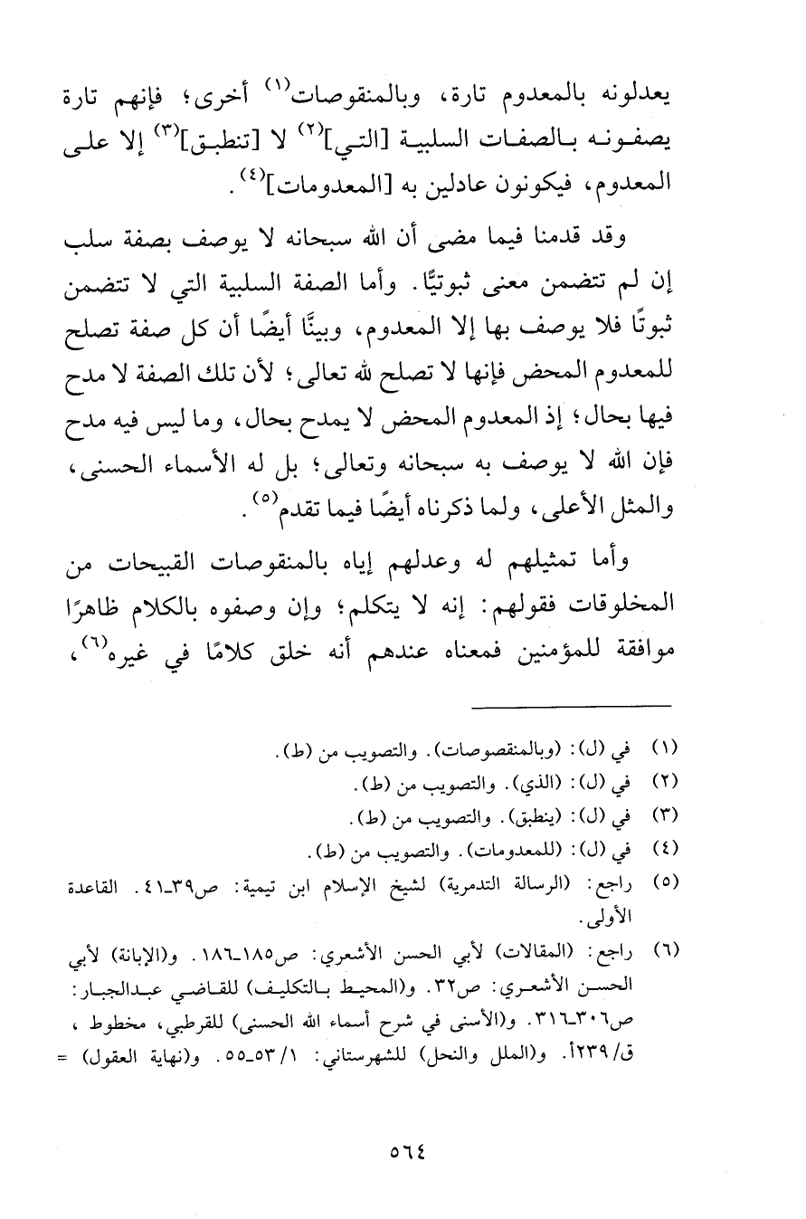 يعدلونه بالمعدوم تارة وبالمنقوصات أخرى فإنهم تارة يصفونه بالصفات السلبية التي لا تنطبق إلا على المعدوم فيكونون عادلين به المعدومات وقد قدمنا فيما مضى أن الله سبحانه لا يوصف بصفة سلب إن لم تتضمن معنى ثبوتيًّا وأما الصفة السلبية التي لا تتضمن ثبوتًا فلا يوصف بها إلا المعدوم وبينَّا أيضًا أن كل صفة تصلح للمعدوم المحض فإنها لا تصلح لله تعالى لأن تلك الصفة لا مدح فيها بحال إذ المعدوم المحض لا يمدح بحال وما ليس فيه مدح فإن الله لا يوصف به سبحانه وتعالى بل له الأسماء الحسنى والمثل الأعلى ولما ذكرناه أيضًا فيما تقدم وأما تمثيلهم له وعدلهم إياه بالمنقوصات القبيحات من المخلوقات فقولهم إنه لا يتكلم وإن وصفوه بالكلام ظاهرًا موافقة للمؤمنين فمعناه عندهم أنه خلق كلامًا في غيره