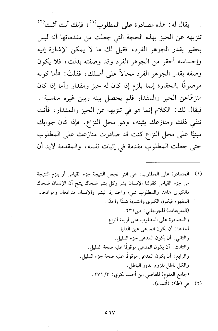 يقال له هذه مصادرة على المطلوب فإنك أنت أثبت تنزيهه عن الحيز بهذه الحجة التي جعلت من مقدماتها أنه ليس بحقير بقدر الجوهر الفرد فقيل لك ما لا يمكن الإشارة إليه وإحساسه أحقر من الجوهر الفرد وقد وصفته بذلك فلا يكون وصفه بقدر الجوهر الفرد محالاً على أصلك فقلتَ أما كونه موصوفًا بالحقارة إنما يلزم إذا كان له حيز ومقدار وأما إذا كان منزهًاعن الحيز والمقدار فلم يحصل بينه وبين غيره مناسبة فيقال لك الكلام إنما هو في تنزيهه عن الحيز والمقدار فأنت تنفي ذلك ومنازعك يثبته وهو محل النزاع فإذا كان جوابك مبنيًّا على محل النزاع كنت قد صادرت منازعك على المطلوب حتى جعلت المطلوب مقدمة في إثبات نفسه والمقدمة لابد أن