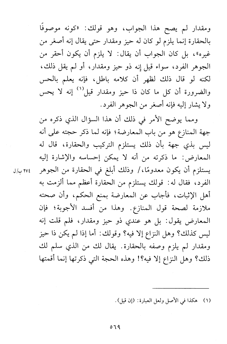 ومقدار لم يصح هذا الجواب وهو قولك كونه موصوفًا بالحقارة إنما يلزم لو كان له حيز ومقدار حتى يقال إنه أصغر من غيره بل كان الجواب أن يقال لا يلزم أن يكون أحقر من الجوهر الفرد سواء قيل إِنه ذو حيز ومقدار أو لم يقل ذلك لكنه لو قال ذلك لظهر أن كلامه باطل فإنه يعلم بالحس والضرورة أن كل ما كان ذا حيز ومقدار قيل إنه لا يحس ولا يشار إليه فإنه أصغر من الجوهر الفرد ومما يوضح الأمر في ذلك أن هذا السؤال الذي ذكره من جهة المنازع هو من باب المعارضة فإنه لما ذكر حجته على أنه ليس بذي جهة بأن ذلك يستلزم التركيب والحقارة قال له المعارض ما ذكرته من أنه لا يمكن إحساسه والإشارة إليه يستلزم أن يكون معدومًا وذلك أبلغ في الحقارة من الجوهر الفرد فقال له قولك يستلزم من الحقارة أعظم مما ألزمت به أهل الإثبات فأجاب عن المعارضة بمنع الحكم وأن صحته ملازمة لصحة قول المنازع وهذا من أفسد الأجوبة فإن المعارض يقول بل هو عندي ذو حيز ومقدار فلم قلت إنه ليس كذلك وهل النزاع إلا فيه وقولك أما إذا لم يكن ذا حيز ومقدار لم يلزم وصفه بالحقارة يقال لك من الذي سلم لك ذلك وهل النزاع إلا فيه وهذه الحجة التي ذكرتها إنما أقمتها