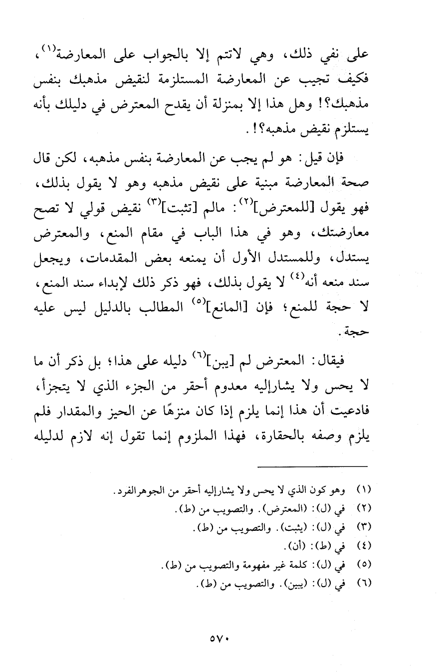 على نفي ذلك وهي لاتتم إلا بالجواب على المعارضة فكيف تجيب عن المعارضة المستلزمة لنقيض مذهبك بنفس مذهبك وهل هذا إلا بمنزلة أن يقدح المعترض في دليلك بأنه يستلزم نقيض مذهبه فإن قيل هو لم يجب عن المعارضة بنفس مذهبه لكن قال صحة المعارضة مبنية على نقيض مذهبه وهو لا يقول ذلك فهو يقول للمعترض مالم تثبت نقيض قولي لا تصح معارضتك وهو في هذا الباب في مقام المنع والمعترض يستدل وللمستدل الأول أن يمنعه بعض المقدمات ويجعل سند منعه أنه لا يقول بذلك فهو ذكر ذلك لإبداء سند المنع لا حجة للمنع فإن المانع المطالب بالدليل ليس عليه حجة فيقال المعترض لم يبن دليله على هذا بل ذكر أن ما لا يحس ولا يشارإليه معدوم أحقر من الجزء الذي لا يتجزأ فادعيت أن هذا إنما يلزم إذا كان منزهًا عن الحيز والمقدار فلم يلزم وصفه بالحقارة فهذا الملزوم إنما تقول إنه لازم لدليله