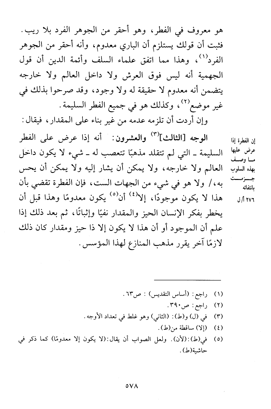 هو معروف في الفطر وهو أحقر من الجوهر الفرد بلا ريب فثبت أن قولك يستلزم أن الباري معدوم وأنه أحقر من الجوهر الفرد وهذا مما اتفق علماء السلف وأئمة الدين أن قول الجهمية أنه ليس فوق العرش ولا داخل العالم ولا خارجه يتضمن أنه معدوم لا حقيقة له ولا وجود وقد صرحوا بذلك في غير موضع وكذلك هو في جميع الفطر السليمة وإن أردت أن تلزمه عدمه من غير بناء على المقدار فيقال الوجه الثالث والعشرون أنه إذا عرض على الفطر السليمة التي لم تقلد مذهبًا تتعصب له شيء لا يكون داخل العالم ولا خارجه ولا يمكن أن يشار إليه ولا يمكن أن يحس به ولا هو في شيء من الجهات الست فإن الفطرة تقضي بأن هذا لا يكون موجودًا إلا أن يكون معدومًا وهذا قبل أن يخطر بفكر الإنسان الحيز والمقدار نفيًا وإثباتًا ثم بعد ذلك إذا علم أن الموجود أو أن هذا لا يكون إلا ذا حيز ومقدار كان ذلك لازمًا آخر يقرر مذهب المنازع لهذا المؤسس