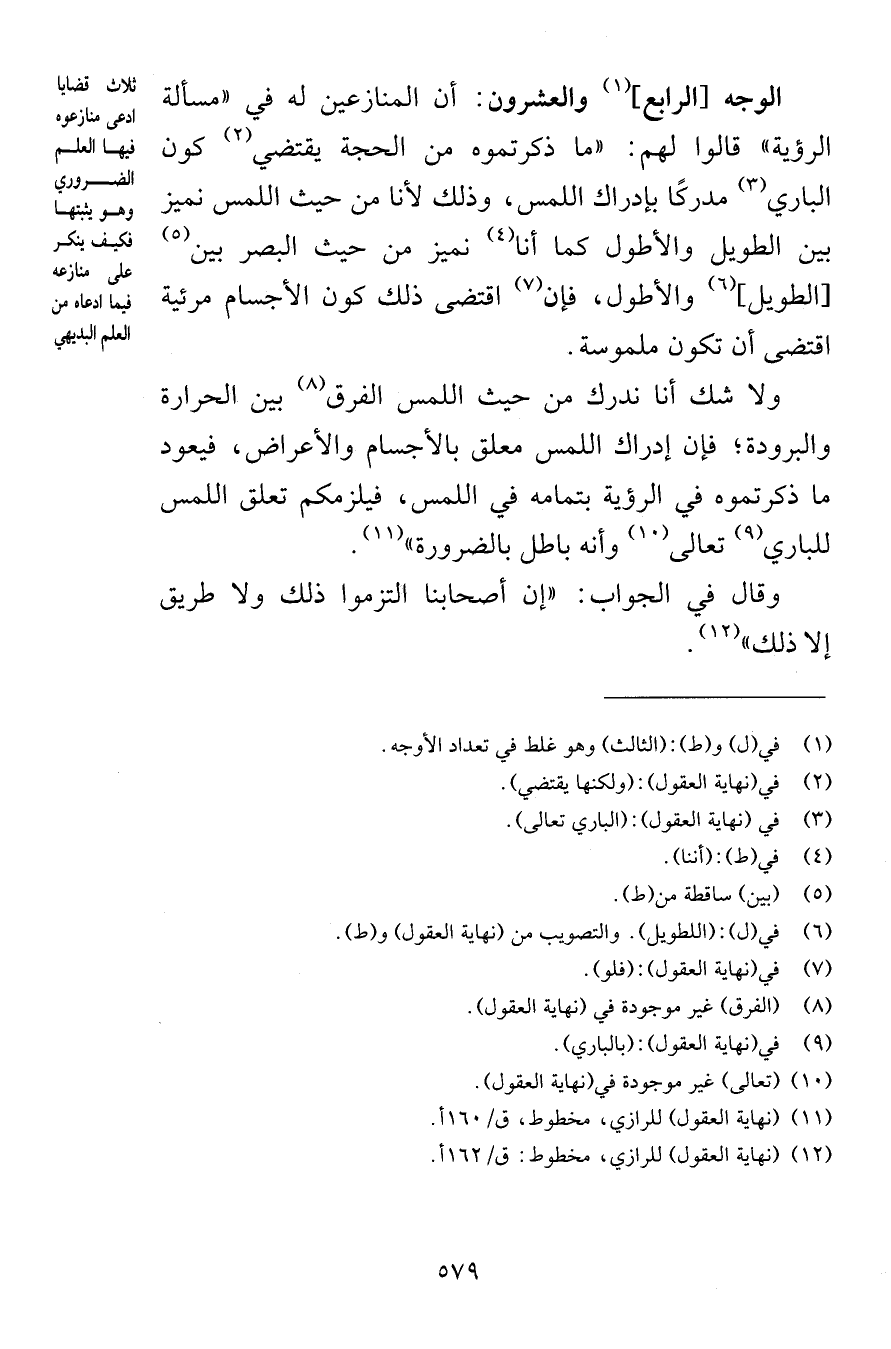 الوجه الرابع والعشرون أن المنازعين له في مسألة الرؤية قالوا لهم ما ذكرتموه من الحجة يقتضي كون الباري مدركًا بإدراك اللمس وذلك لأنا من حيث اللمس نميز بين الطويل والأطول كما أن نميز من حيث البصر بين الطويل والأطول فإن اقتضى ذلك كون الأجسام مرئية اقتضى أن تكون ملموسة ولا شك أنا ندرك من حيث اللمس الفرق بين الحرارة والبرودة فإن إدراك اللمس معلق بالأجسام والأعراض فيعود ما ذكرتموه من الرؤية بتمامه في اللمس فيلزمكم تعلق اللمس للباري تعالى وأنه باطل بالضرورة وقال في الجواب إن أصحابنا التزموا ذلك ولا طريق إلا ذلك