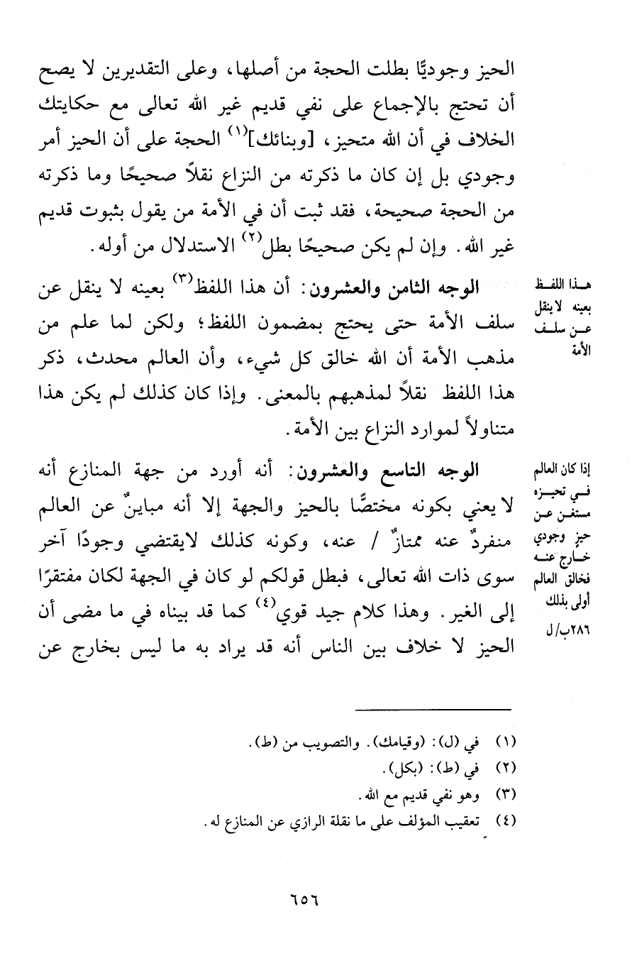 الحيز وجوديًّا بطلت الحجة من أصلها وعلى التقديرين لا يصح أن تحتج بالإجماع على نفي قديم غير الله تعالى مع حكايتك الخلاف في أن الله متحيز وبنائك الحجة على أن الحيز أمر وجودي بل إن كان ما ذكرته من النزاع نقلاً صحيحًا وما ذكرته من الحجة صحيحة فقد ثبت أن في الأمة من يقول بثبوت قديم غير الله وإن لم يكن صحيحًا بطل الاستدلال من أوله الوجه الثامن والعشرون أن هذا اللفظ بعينه لا ينقل عن سلف الأمة حتى يحتج بمضمون اللفظ ولكن لما علم من مذهب الأمة أن الله خالق كل شيء وأن العالم محدث ذكر هذا اللفظ نقلاً لمذهبهم بالمعنى وإذا كان كذلك لم يكن هذا متناولاً لموارد النزاع بين الأمة الوجه التاسع والعشرون أنه أورد من جهة المنازع أنه لا يعني بكونه مختصًّا بالحيز والجهة إلا أنه مباينٌ عن العالم منفردٌ عنه ممتازٌ عنه وكونه كذلك لا يقتضي وجودًا آخر سوى ذات الله تعالى فبطل قولكم لو كان في الجهة لكان مفتقرًا إلى الغير وهذا كلام جيد قوي كما قد بيناه فيما مضى أن الحيز لا خلاف بين الناس أنه قد يراد به ما ليس بخارج عن