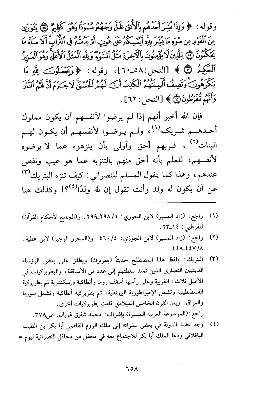 وقوله وَإِذَا بُشِّرَ أَحَدُهُمْ بِالأُنثَى ظَلَّ وَجْهُهُ مُسْوَدّاً وَهُوَ كَظِيمٌ {58} يَتَوَارَى مِنَ الْقَوْمِ مِن سُوءِ مَا بُشِّرَ بِهِ أَيُمْسِكُهُ عَلَى هُونٍ أَمْ يَدُسُّهُ فِي التُّرَابِ أَلاَ سَاء مَا يَحْكُمُونَ {59} لِلَّذِينَ لاَ يُؤْمِنُونَ بِالآخِرَةِ مَثَلُ السَّوْءِ وَلِلّهِ الْمَثَلُ الأَعْلَىَ وَهُوَ الْعَزِيزُ الْحَكِيمُ {60} [النحل 58-60] وقوله وَيَجْعَلُونَ لِلّهِ مَا يَكْرَهُونَ وَتَصِفُ أَلْسِنَتُهُمُ الْكَذِبَ أَنَّ لَهُمُ الْحُسْنَى لاَ جَرَمَ أَنَّ لَهُمُ الْنَّارَ وَأَنَّهُم مُّفْرَطُونَ {62} [النحل 62] فإن الله أخبر أنهم إذا لم يرضوا لأنفسهم أن يكون مملوك أحدهم شريكه ولم يرضوا لأنفسهم أن يكون لهم البنات فربهم أحق وأولى بأن ينزهوه عما لا يرضوه لأنفسهم للعلم بأنه أحق منهم بالتنزيه عما هو عيب ونقص عندهم وهذا كما يقول المسلم للنصراني كيف تنزه البتريك عن أن يكون له ولد وأنت تقول إن لله ولدًا وكذلك هنا