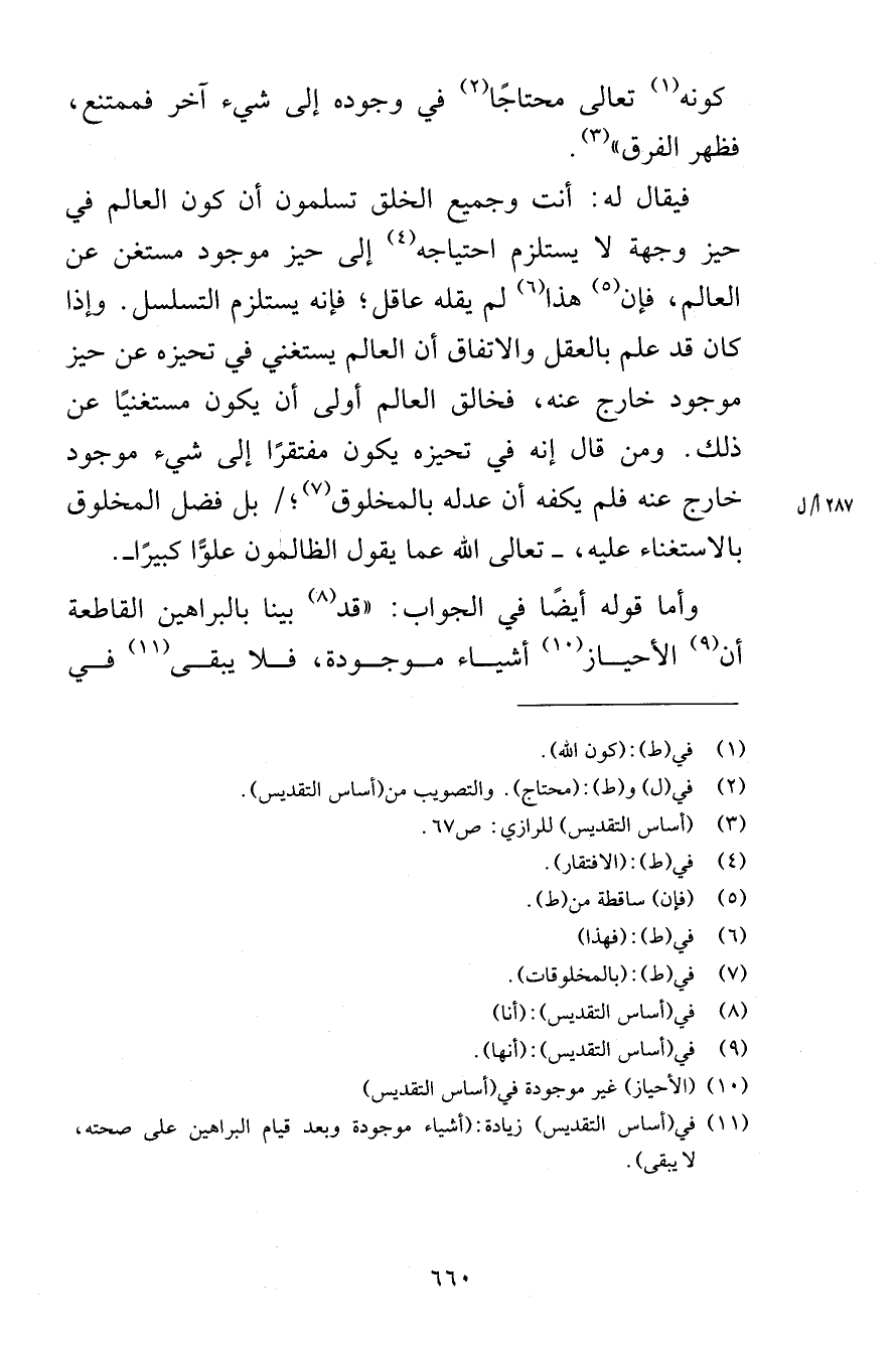 كونه تعالى محتاجًا في وجوده إلى شيء آخر فممتنع فظهر الفرق فيقال له أنت وجميع الخلق تسلمون أن كون العالم في حيز وجهة لا يستلزم احتياجه إلى حيز موجود مستغن عن العالم فإن هذا لم يقله عاقل فإنه يستلزم التسلسل وإذا كان قد علم بالعقل والاتفاق أن العالم يستغني في تحيزه عن حيز موجود خارج عنه فخالق العالم أولى أن يكون مستغنيًا عن ذلك ومن قال إنه في تحيزه يكون مفتقرًا إلى شيء موجود خارج عنه فلم يكفه أن عدله بالمخلوق بل فضل المخلوق بالاستغناء عليه تعالى الله عما يقول الظالمون علوًّا كبيرًا وأما قوله أيضًا في الجواب قد بينا بالبراهين القاطعة أن الأحياز أشياء موجودة فلا يبقى في