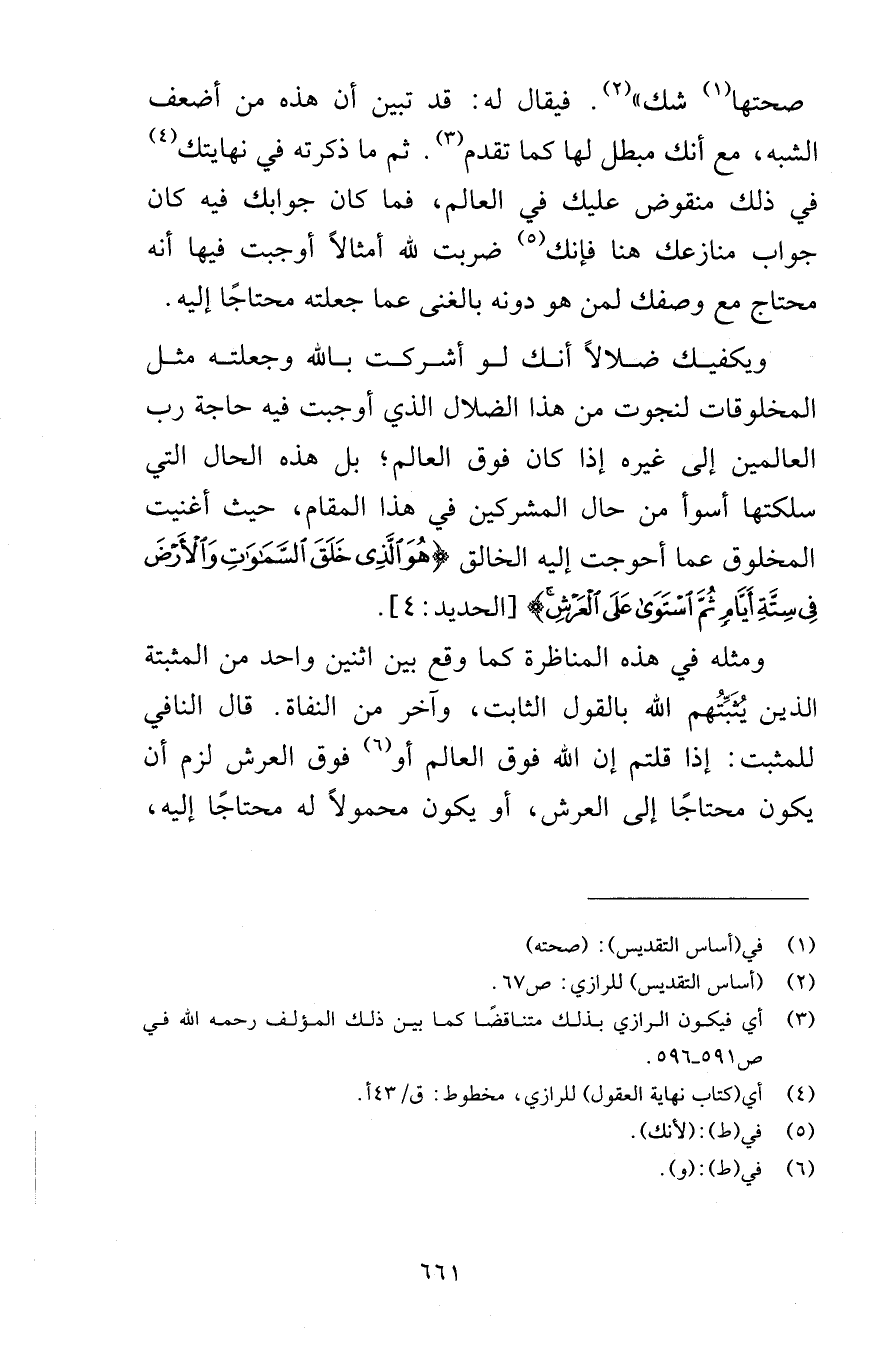 صحتها شك فيقال له قد تبين أن هذه من أضعف الشبه مع أنك مبطل لها كما تقدم ثم ما ذكرته في نهايتك في ذلك منقوض عليك في العالم فما كان جوابك فيه كان جواب منازعك هنا فإنك ضربت لله أمثالاً أوجبت فيها أنه محتاج مع وصفك لمن هو دونه بالغنى عما جعلته محتاجًا إليه ويكفيك ضلالاً أنك لو أشركت بالله وجعلته مثل المخلوقات لنجوت من هذا الضلال الذي أوجبت فيه حاجة رب العالمين إلى غيره إذا كان فوق العالم بل هذه الحال التي سلكتها أسوأ من حال المشركين في هذا المقام حيث أغنيت المخلوق عما أحوجت إليه الخالق هُوَ الَّذِي خَلَقَ السَّمَاوَاتِ وَالْأَرْضَ فِي سِتَّةِ أَيَّامٍ ثُمَّ اسْتَوَى عَلَى الْعَرْشِ [الحديد 4] ومثله في هذه المناظرة كما وقع بين اثنين واحد من المثبتة الذين يُثَبِّتُهم الله بالقول الثابت وآخر من النفاة قال النافي للمثبت إذا قلتم أن الله فوق العالم أو فوق العرش لزم أن يكون محتاجًا إلى العرش أو يكون محمولاً له محتاجًا إليه