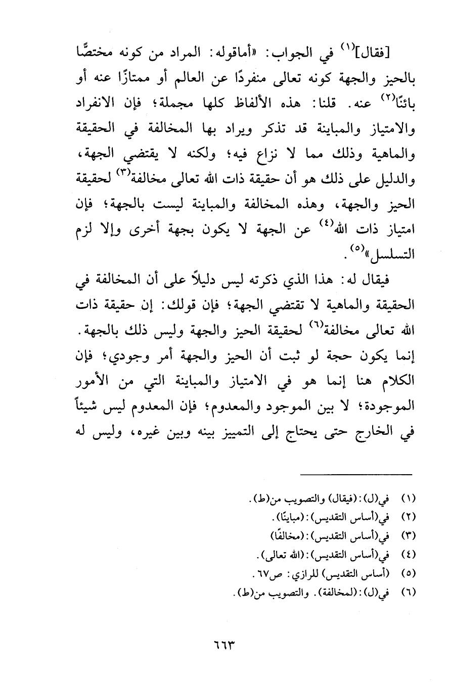 فقال في الجواب أماقوله المراد من كونه مختصًّا بالحيز والجهة كونه تعالى منفردًا عن العالم أو ممتازًا عنه أو بائنًا عنه قلنا هذه الألفاظ كلها مجملة فإن الانفراد والامتياز والمباينة قد تذكر ويراد بها المخالفة في الحقيقة والماهية وذلك مما لا نزاع فيه ولكنه لا يقتضي الجهة والدليل على ذلك هو أن حقيقة ذات الله تعالى مخالفة لحقيقة الحيز والجهة وهذه المخالفة والمباينة ليست بالجهة فإن امتياز ذات الله عن الجهة لا يكون بجهة أخرى وإلا لزم التسلسل فيقال له هذا الذي ذكرته ليس دليلاً على أن المخالفة في الحقيقة والماهية لا تقتضي الجهة فإن قولك إن حقيقة ذات الله تعالى مخالفة لحقيقة الحيز والجهة وليس ذلك بالجهة إنما يكون حجة لو ثبت أن الحيز والجهة أمر وجودي فإن الكلام هنا إنما هو في الامتياز والمباينة التي من الأمور الموجودة لا بين الموجود والمعدوم فإن المعدوم ليس شيئاً في الخارج حتى يحتاج إلى التمييز بينه وبين غيره وليس له