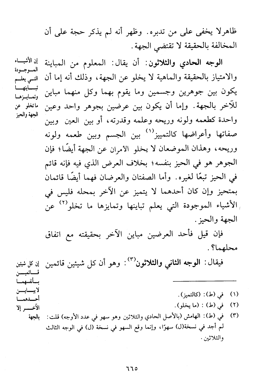 ظاهرلا يخفى على من تدبره وظهر أنه لم يذكر حجة على أن المخالفة بالحقيقة لا تقتضي الجهة الوجه الحادي والثلاثون أن يقال المعلوم من المباينة والامتياز بالحقيقة والماهية لا يخلو عن الجهة وذلك أنه إما أن يكون بين جوهرين وجسمين وما يقوم بهما وكل منهما مباين للآخر بالجهة وإما أن يكون بين عرضين بجوهر واحد وعين واحدة كطعمه ولونه وريحه وعلمه وقدرته أو بين العين وبين صفاتها وأعراضها كالتمييز بين الجسم وبين طعمه ولونه وريحه وهذان الموضعان لا يخلو الأمران عن الجهة أيضًا فإن الجوهر هو في الحيز بنفسه بخلاف العرض الذي فيه فإنه قائم في الحيز تبعًا لغيره وأما الصفتان والعرضان فهما أيضًا قائمان بمتحيز وإن كان أحدهما لا يتميز عن الآخر بمحله فليس في الأشياء الموجودة التي يعلم تباينها وتمايزها ما تخلو عن الجهة والحيز فإن قيل فأحد العرضين مباين الآخر بحقيقته مع اتفاق محلهما فبقال الوجه الثاني والثلاثون وهو أن كل شيئين قائمين