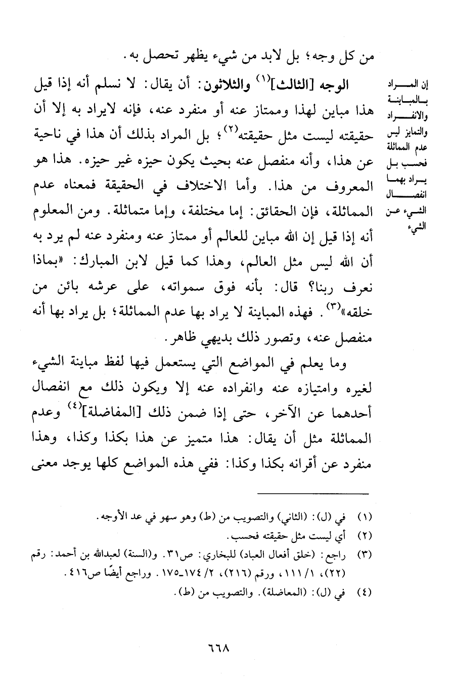 من كل وجه بل لابد من شيء يظهر تحصل به الوجه الثالث والثلاثون أن يقال لا نسلم أنه إذا قيل هذا مباين لهذا وممتاز عنه أو منفرد عنه فإنه لا يراد به إلا أن حقيقته ليست مثل حقيقته بل المراد بذلك أن هذا في ناحية عن هذا وأنه منفصل عنه بحيث يكون حيزه غير حيزه هذا هو المعروف من هذا وأما الاختلاف في الحقيقة فمعناه عدم المماثلة فإن الحقائق إما مختلفة وإما متماثلة ومن المعلوم أنه إذا قيل إن الله مباين للعالم أو ممتاز عنه ومنفرد عنه لم يرد به أن الله ليس مثل العالم وهذا كما قيل لابن مبارك بماذا نعرف ربنا قال بأنه فوق سمواته على عرشه بائن من خلقه فهذه المباينة لا يراد بها عدم المماثلة بل يراد بها أنه منفصل عنه وتصور ذلك بديهي ظاهر وما يعلم في المواضع التي يستعمل فيها لفظ مباينة الشيء لغيره وامتيازه عنه وانفراده عنه إلا ويكون ذلك مع انفصال أحدهما عن الآخر حتى إذا ضمن ذلك المفاضلة وعدم المماثلة مثل أن يقال هذا متميز عن هذا بكذا وكذا وهذا منفرد عن أقرانه بكذا وكذا ففي هذه المواضع كلها يوجد معنى