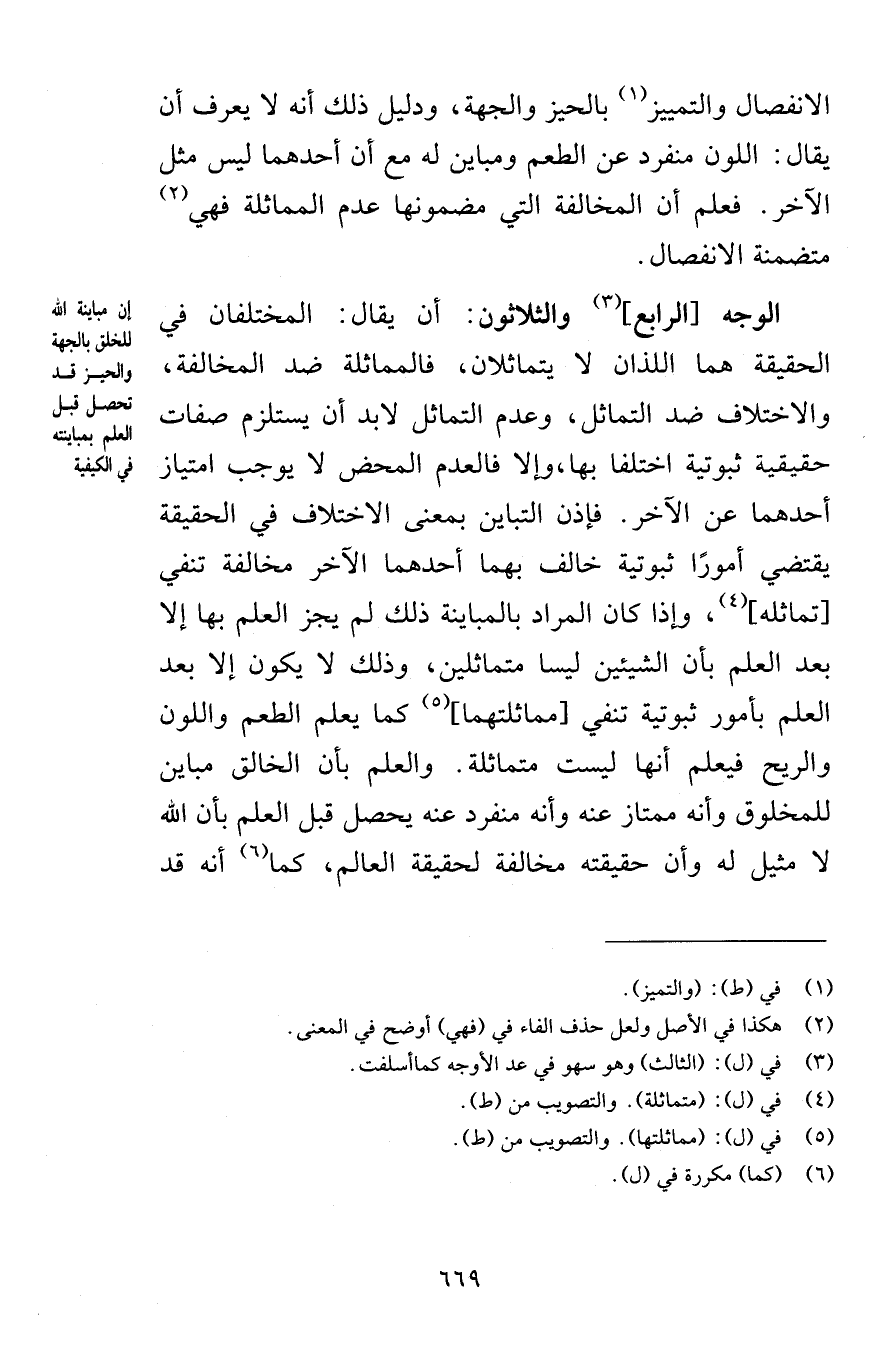 الانفصال والتمييز بالحيز والجهة ودليل ذلك أنه لا يعرف أن يقال اللون منفرد عن الطعم ومباين له مع أن أحدهما ليس مثل الآخر فعلم أن المخالفة التي مضمونها عدم المماثلة فهي متضمنة الانفصال الوجه الرابع والثلاثون أن يقال المختلفان في الحقيقة هما اللذان لا يتماثلان فالمماثلة ضد المخالفة والاختلاف ضد التماثل وعدم التماثل لابد أن يستلزم صفات حقيقية ثبوتية اختلفا بها وإلا فالعدم المحض لا يوجب امتياز أحدهما عن الآخر فإذن التباين بمعنى الاختلاف في الحقيقة يقتضي أمورًا ثبوتية خالف بهما أحدهما الآخر مخالفة تنفي تماثله وإذا كان المراد بالمباينة ذلك لم يجز العلم بها إلا بعد العلم بأن الشيئين ليسا متماثلين وذلك لا يكون إلا بعد العلم بأمور ثبوتية تنفي مماثلتهما كما يعلم الطعم واللون والريح فيعلم أنها ليست متماثلة والعلم بأن الخالق مباين للمخلوق وأنه ممتاز عنه وأنه منفرد عنه يحصل قيل العلم بان الله لا مثيل له وأن حقيقته مخالفة لحقيقة العالم كما أنه قد