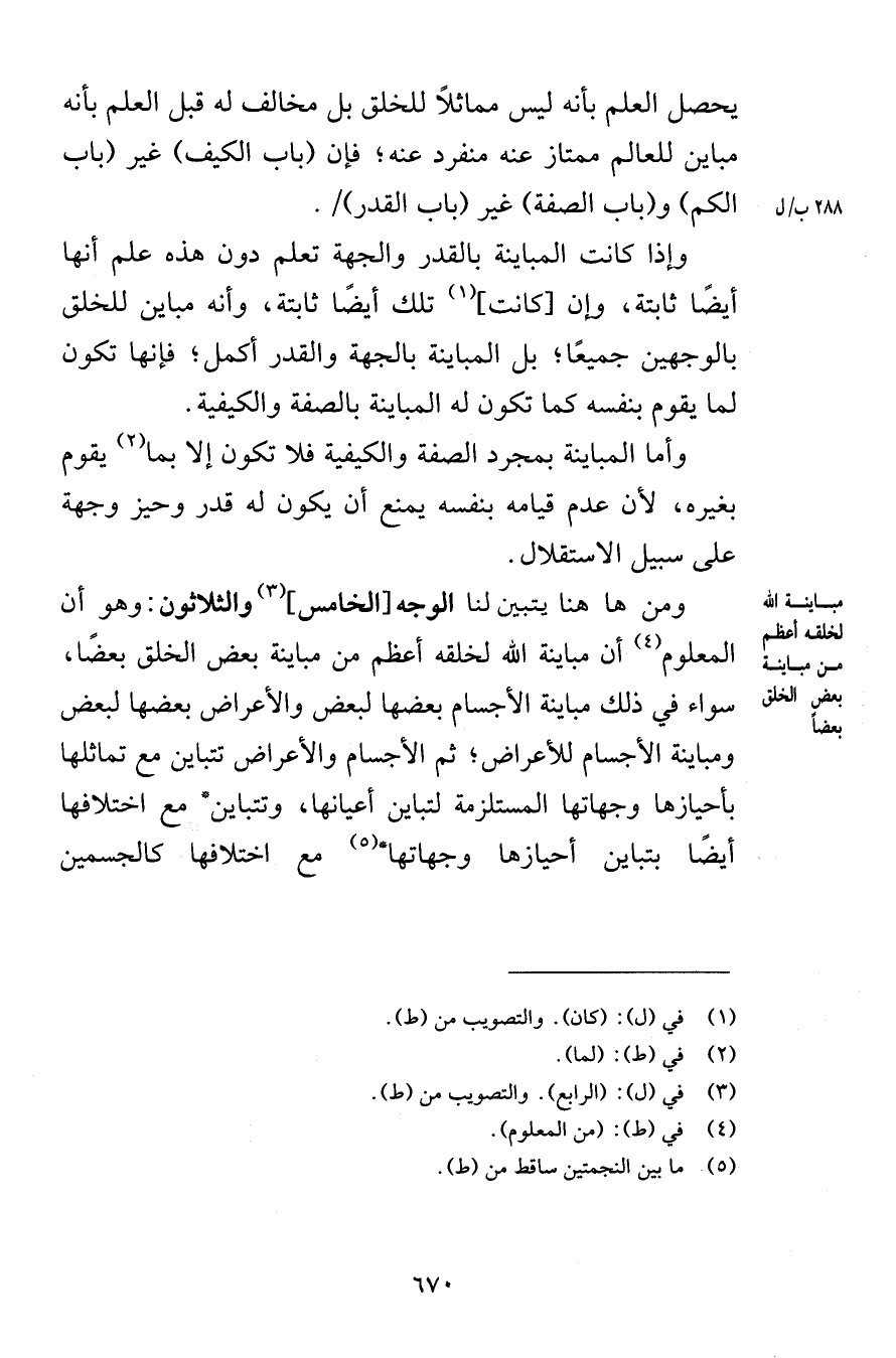 يحصل العلم بأنه ليس مماثلاً للخلق بل مخالف له قبل العلم بأنه مباين للعالم ممتاز عنه منفرد عنه فإن باب الكيف غير باب الكم وباب الصفة غير باب القدر وإذا كانت المباينة بالقدر والجهة تعلم دون هذه علم أنها أيضًا ثابتة وإن كانت تلك أيضًا ثابتة وأنه مباين للخلق بالوجهين جميعًا بل المباينة بالجهة والقدر أكمل فإنها تكون لما يقوم بنفسه كما تكون له المباينة بالصفة والكيفية وأما المباينة بمجرد الصفة والكيفية فلا تكون إلا بما يقوم بغيره لأن عدم قيامه بنفسه يمنع أن يكون له قدر وحيز وجهة على سبيل الاستقلال ومن ها هنا يتبين لنا الوجه الخامس والثلاثون وهو أن المعلوم أن مباينة الله لخلقه أعظم من مباينة بعض الخلق بعضًا سواء في ذلك مباينة الأجسام بعضها لبعض والأعراض بعضها لبعض ومباينة الأجسام للأعراض ثم الأجسام والأعراض تتباين مع تماثلها بأحياز وجهاتها المستلزمة لتباين أعيانها وتتباين مع اختلافها أيضًا بتباين أحيازها وجهاتها مع اختلافها كالجسمين