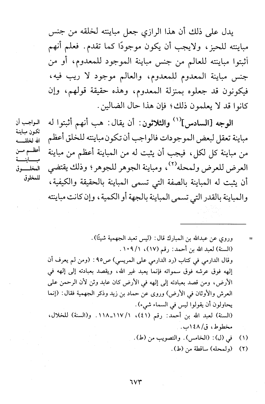 يدل على ذلك أن هذا الرازي جعل مباينته لخلقه من جنس مباينته للحيز ولايجب أن يكون موجودًا كما تقدم فعلم أنهم أثبتوا مباينته للعالم من جنس مباينة الموجود للمعدوم أو من جنس مباينة المعدوم للمعدوم والعالم موجود لا ريب فيه فيكونون قد جعلوه بمنزلة المعدوم وهذه حقيقة قولهم وإن كانوا قد لا يعلمون ذلك فإن هذا حال الضالين الوجه السادس والثلاثون أن يقال هب أنهم أثبتوا له مباينة تعقل لبعض الموجودات فالواجب أن تكون مباينته للخلق أعظم من مباينة كل لكل فيجب أن يثبت له من المباينة أعظم من مباينة العرض للعرض ولمحله ومباينة الجوهر للجوهر وذلك يقتضي أن يثبت له المباينة بالصفة الني تسمى المباينة بالحقيقة والكيفية والمباينة بالقدر التي تسمى المباينة بالجهة أو الكمية وإن كانت مباينته
