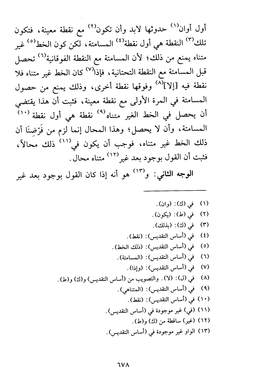 أول أوان حدوثها لابد وأن تكون مع نقطة معينة فتكون تلك النقطة هي أول نقطة المسامتة لكن كون الخط غير متناه يمنع من ذلك لأن المسامتة مع النقطة الفوقانية تحصل قبل المسامتة مع النقطة التحتانية فإذا كان الخط غير متناه فلا نقطة فيه إلا وفوقها نقطة أخرى وذلك يمنع من حصول المسامتة في المرة الأولى مع نقطة معينة فثبت أن هذا يقتضي أن يحصل في الخط الغير متناه نقطة هي أول نقطة المسامتة وأن لا يحصل وهذا المحال إنما لزم من فَرْضِنَا أن ذلك الخط غير متناه فوجب أن يكون في ذلك محالاً فثبت أن القول بوجود بعد غير متناه محال الوجه الثاني وهو أنه إذا كان القول بوجود بعد غير