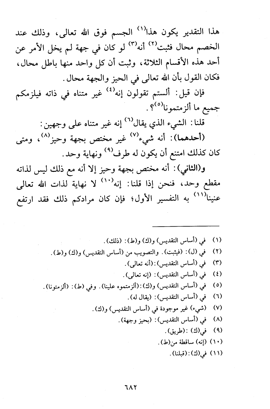 هذا التقدير يكون هذا الجسم فوق الله تعالى وذلك عند الخصم محال فثبت أنه لو كان في جهة لم يخل الأمر عن أحد هذه الأقسام الثلاثة وثبت أن كل واحد منها باطل محال فكان القول بأن الله تعالى في الحيز والجهة محال فإن قيل ألستم تقولون إنه غير متناه في ذاته فيلزمكم جميع ما ألزمتمونا قلنا الشيء الذي يقال إنه غير متناه على وجهين أحدهما أنه شيء غير مختص بجهة وحيز ومتى كان كذلك امتنع أن يكون له طرف ونهاية وحد والثاني أنه مختص بجهة وحيز إلا أنه مع ذلك ليس لذاته مقطع وحد فنحن إذا قلنا إنه لا نهاية لذات الله تعالى عنينا به التفسير الأول فإن كان مرادكم ذلك فقد ارتفع