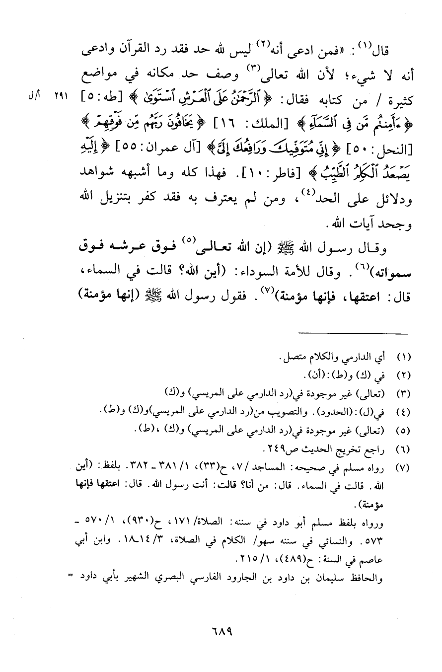 قال فمن ادعى أنه ليس لله حد فقد رد القرآن وادعى أنه لا شيء لأن الله تعالى وصف حد مكانه في مواضع كثيرة من كتابه فقال الرَّحْمَنُ عَلَى الْعَرْشِ اسْتَوَى [طه 5] أَأَمِنتُم مَّن فِي السَّمَاء [الملك 16] يَخَافُونَ رَبَّهُم مِّن فَوْقِهِمْ [النحل 50] إِنِّي مُتَوَفِّيكَ وَرَافِعُكَ إِلَيَّ [آل عمران 55] إِلَيْهِ يَصْعَدُ الْكَلِمُ الطَّيِّبُ [فاطر 10] فهذا كله وما أشبهه شواهد ودلائل على الحد ومن لم يعترف به فقد كفر بتنزيل الله وجحد آيات الله وقال رسول الله صلى الله عليه وسلم إن الله تعالى فوق عرشه فوق سمواته وقال للأمة السوداء أين الله قالت في السماء قال اعتقها فإنها مؤمنة فقول رسول الله صلى الله عليه وسلم إنها مؤمنة