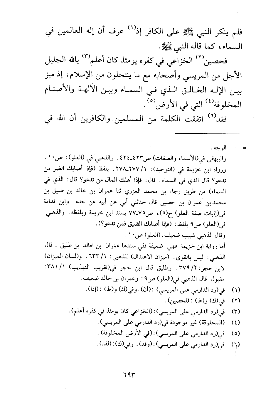 فلم ينكر النبي صلى الله عليه وسلم على الكافر إذ عرف أن إله العالمين في السماء كما قاله النبي صلى الله عليه وسلم فحصين الخزاعي في كفره يومئذ كان أعلم بالله الجليل الأجل من المريسي وأصحابه مع ما ينتحلون من الإسلام إذ ميز بين الإله الخالق الذي في السماء وبين الآلهة والأصنام المخلوقة التي في الأرض فقد اتفقت الكلمة من المسلمين والكافرين أن الله في