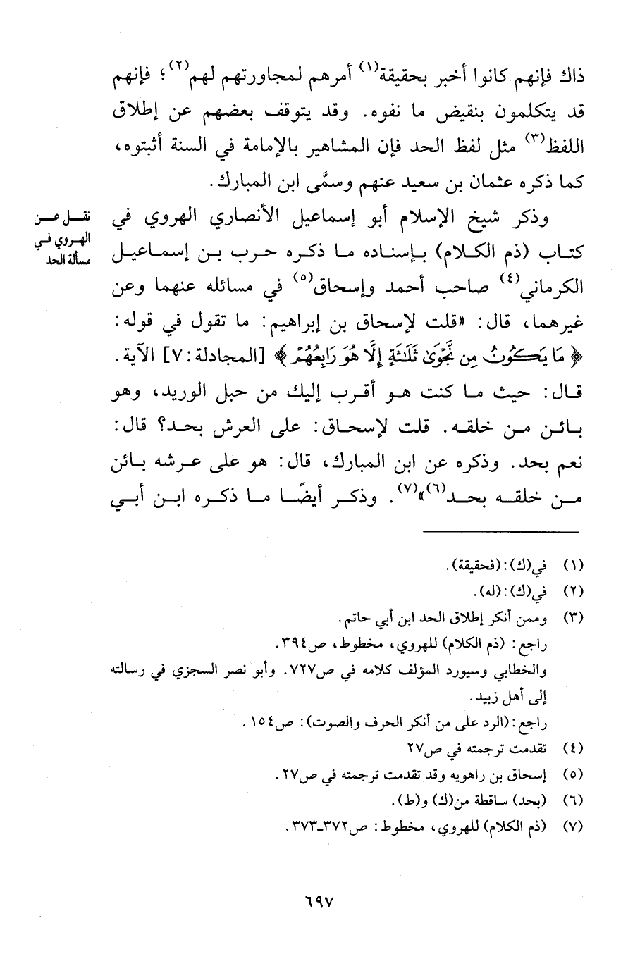 ذاك فإنهم كانوا أخبر بحقيقة أمرهم لمجاورتهم لهم فإنهم قد يتكلمون بنقيض ما نفوه وقد يتوقف بعضهم عن إطلاق اللفظ مثل لفظ الحد فإن المشاهير بالإمامة في السنة أثبتوه كما ذكره عثمان بن سعيد عنهم وسمَّى ابن المبارك وذكر شيخ الإسلام أبو إسماعيل الأنصاري الهروي في كتاب ذم الكلام بإسناد ما ذكره حرب بن إسماعيل الكرماني صاحب أحمد وإسحاق في مسائله عنهما وعن غيرهما قال قلت لإسحاق بن إبراهيم ما تقول في قوله مَا يَكُونُ مِن نَّجْوَى ثَلَاثَةٍ إِلَّا هُوَ رَابِعُهُمْ [المجادلة 7] الآية قال حيث ما كنت هو أقرب إليك من حبل الوريد وهو بائن من خلقه قلت لإسحاق على العرش بحد قال نعم بحد وذكره عن ابن المبارك قال هو على عرشه بائن من خلقه بحد وذكر أيضًا ما ذكره ابن أبي