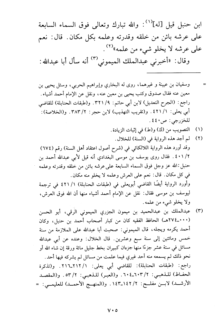 ابن حنبل قيل له والله تبارك وتعالى فوق السماء السابعة على عرشه بائن من خلقه وقدرته وعلمه بكل مكان قال نعم على عرشه لا يخلو شيء من علمه وقال أخبرني عبد الملك الميموني أنه سأل أبا عبد الله