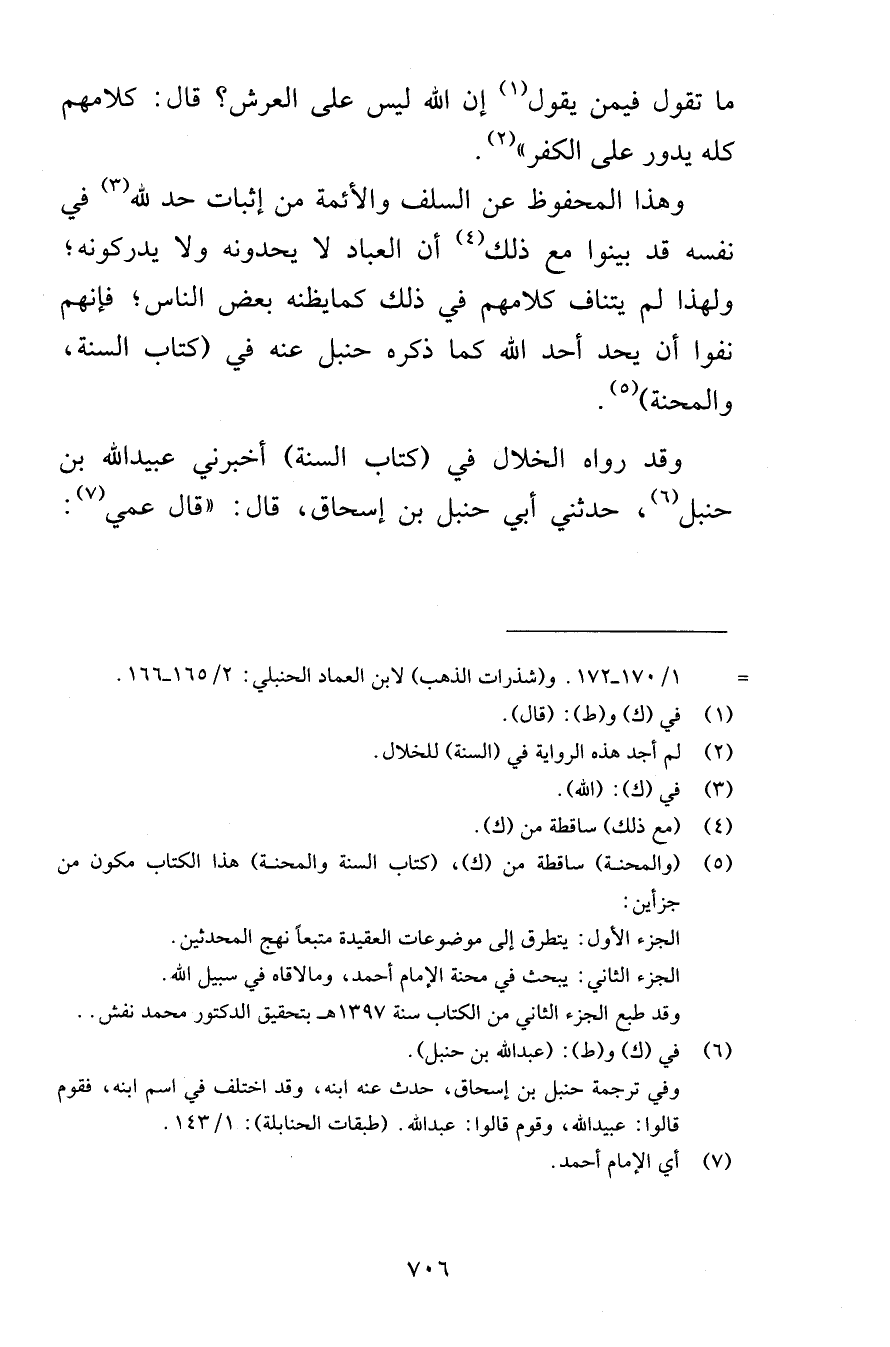 ما تقول فيمن يقول إن الله ليس على العرش قال كلامهم كله يدور على الكفر وهذا المحفوظ عن السلف والأئمة من إثبات حد لله في نفسه قد بينوا مع ذلك أن العباد لا يحدونه ولا يدركونه ولهذا لم يتناف كلامهم في ذلك كمايظنه بعض الناس فإنهم نفوا أن يحد أحد الله كما ذكره حنبل عنه في كتاب السنة والمحنة وقد رواه الخلال في كتاب السنة أخبرني عبيد الله بن حنبل حدثني أبي حنبل بن إسحاق قال قال عمي