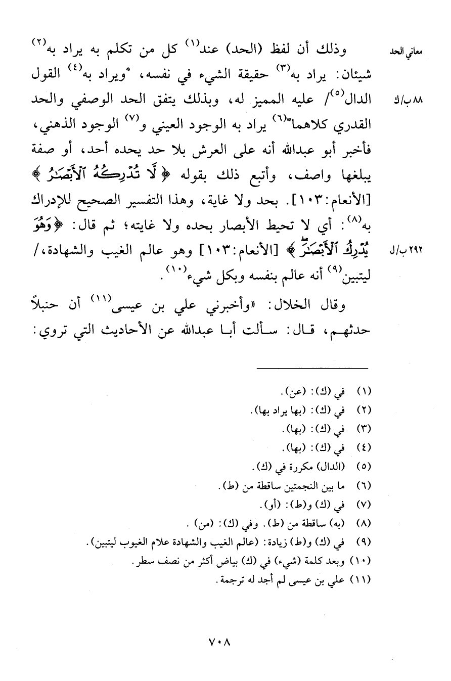 وذلك أن لفظ الحد عند كل من تكلم به يراد به شيئان يراد به حقيقة الشيء نفسه ويراد به القول الدال عليه المميز له وبذلك يتفق الحد الوصفي والحد القدري كلاهما يراد به الوجود العيني والوجود الذهني فأخبر أبو عبد الله أنه على العرش بلا حد يحده أحد أو صفة يبلغها واصف وأتبع ذلك بقوله لاَّ تُدْرِكُهُ الأَبْصَارُ [الأنعام 103] بحد ولا غاية وهذا التفسير الصحيح للإدراك به أي لا تحيط الأبصار بحده ولا غايته ثم قال وَهُوَ يُدْرِكُ الأَبْصَارَ [الأنعام 103] وهو عالم الغيب والشهادة ليتبين أنه عالم بنفسه وبكل شيء وقال الخلال وأخبرني علي بن عيسى أن حنبلاً حدثهم قال سألت أبا عبد الله عن الأحاديث التي تروى