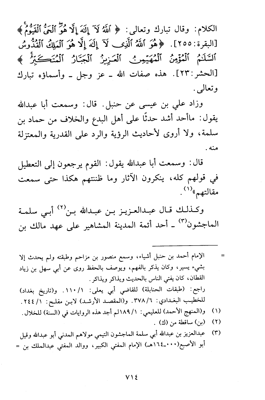 الكلام وقال تبارك وتعالى اللهُ لاَ إِلَهَ إِلاَّ هُوَ الْحَيُّ الْقَيُّومُ [البقرة 255] هُوَ اللَّهُ الَّذِي لَا إِلَهَ إِلَّا هُوَ الْمَلِكُ الْقُدُّوسُ السَّلَامُ الْمُؤْمِنُ الْمُهَيْمِنُ الْعَزِيزُ الْجَبَّارُ الْمُتَكَبِّرُ [الحشر 23] هذه صفات الله عز وجل وأسماؤه تبارك وتعالى وزاد علي بن عيسى عن حنبل قال وسمعت أبا عبد الله يقول ماأحد أشد حدثًا على أهل البدع والخلاف من حماد بن سلمة ولا أروى لأحاديث الرؤية والرد على القدرية والمعتزلة منه قال وسمعت أبا عبد الله يقول القوم يرجعون إلى التعطيل في قولهم كله ينكرون الآثار وما ظننتهم هكذا حتى سمعت مقالتهم وكذلك قال عبد العزيز بن عبد الله بن أبي سلمة الماجشون أحد أئمة المدينة المشاهير على عهد مالك بن