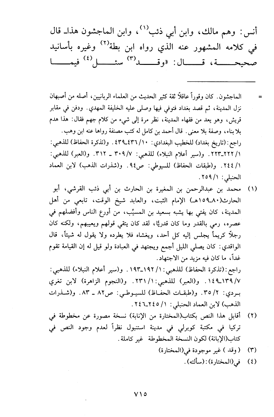 أنس وهم مالك وابن أبي ذئب وابن الماجشون هذا قال في كلامه المشهور عنه الذي رواه ابن بطة وغيره بأسانيد صحيحة قال وقد سئل فيما