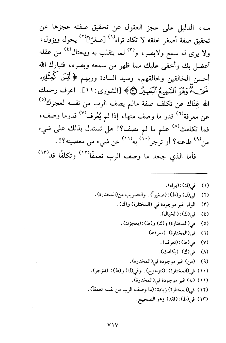 منه الدليل على عجز العقول عن تحقيق صفته عجزها عن تحقيق صفة أصغر خلقه لا تكاد تراه صغرًا يحول ويزول ولا يرى له سمع ولابصر ولما يتقلب به ويحتال من عقله أعضل بك وأخفى عليك مما ظهر من سمعه وبصره فتبارك الله أحسن الخالقين وخالقهم وسيد السادة وربهم لَيْسَ كَمِثْلِهِ شَيْءٌ وَهُوَ السَّمِيعُ البَصِيرُ {11} [الشورى 11] اعرف رحمك الله غنَاك عن تكلف صفة مالم يصف الرب من نفسه لعجزك عن معرفة قدر ما وصف منها إذا لم يُعْرف قدرما وصف فما تكلفك علم ما لم يصف هل تستدل بذلك على شيء من طاعته أو تزجر به عن شيء من معصيته فأما الذي جحد ما وصف الرب تعمقًا وتكلفًا قد
