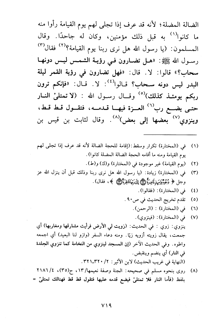 الضالة المضلة لأنه قد عرف إذا تجلى لهم يوم القيامة رأوا منه ما كانوا به قبل ذلك مؤمنين وكان له جاحدًا وقال المسلمون يا رسول الله هل نرى ربنا يوم القيامة فقال رسول الله صلى الله عليه وسلم هل تضارون من رؤية الشمس ليس دونها سحاب قالوا لا قال فهل تضارون رؤية القمر ليلة البدر ليس دونه سحاب قالوا لا قال فإنكم ترون ربكم يومئذ كذلك وقال رسول الله لا تمتلئ النار حتى يضع رب العزة فيها قدمه فتقول قط قط وينزوي بعضها إلى بعض وقال لثابت بن قيس بن