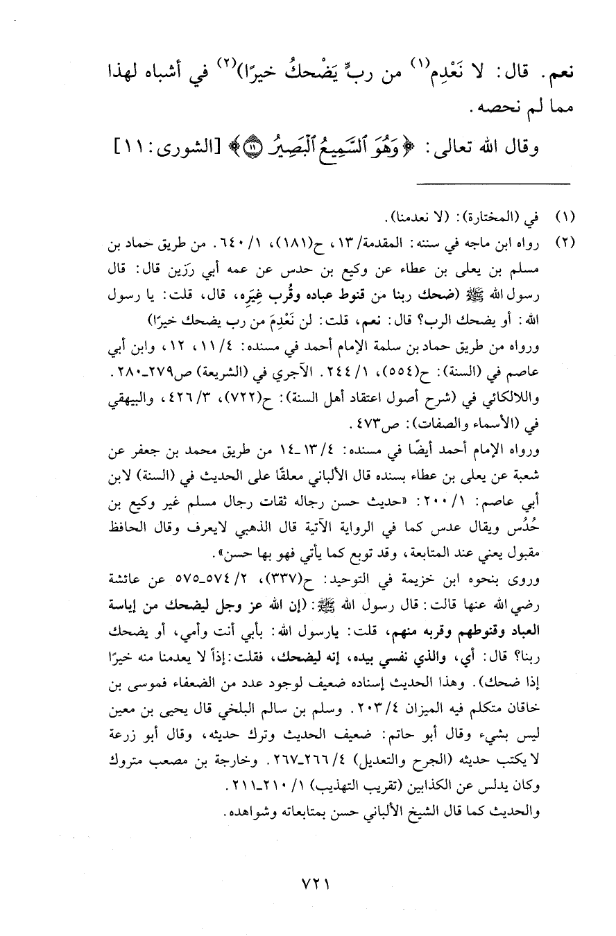 نعم قال لا نَعْدِم من ربٍّ يَضْحكُ خيرًا في أشباه لهذا مما لم نحصه وقال الله تعالى وَهُوَ السَّمِيعُ البَصِيرُ {11} [الشورى 11]