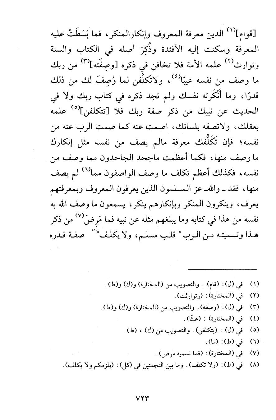 قوام الدين معرفة المعروف وإنكارالمنكر فما بَسَطَتْ عليه المعرفة وسكنت إليه الأفئدة وذُكِرَ أصله في الكتاب والسنة وتوارث علمه الأمة فلا تخافن في ذكره وصِفَته من ربك ما وصف من نفسه عيبًا ولاتَكلَّفن لما وُصِفَ لك من ذلك قدرًا وما أَنْكَرته نفسك ولم تجد ذكره في كتاب ربيك ولا في الحديث عن نبيك من ذكر صفة ربك فلا تتكلفن علمه بعقلك ولاتصفه بلسانك اصمت عنه كما صمت الرب عنه من نفسه فإن تَكَلُّفك معرفة مالم يصف من نفسه مثل إنكارك ما وصف منها فكما أعظمت ماجحد الجاحدون مما وصف من نفسه فكذلك أعظم تكلف ماوصف الواصفون مما لم يصف منها فقد والله عز المسلمون الذين يعرفون المعروف وبمعرفتهم يعرف وينكرون المنكر وبإنكارهم ينكر يسمعون ما وصف الله به نفسه من هذا في كتابه وما يبلغهم مثله عن نبيه فما مَرِضَ من ذكر هذا وتسميته من الرب قلب مسلم ولا يكلف صفة قدره