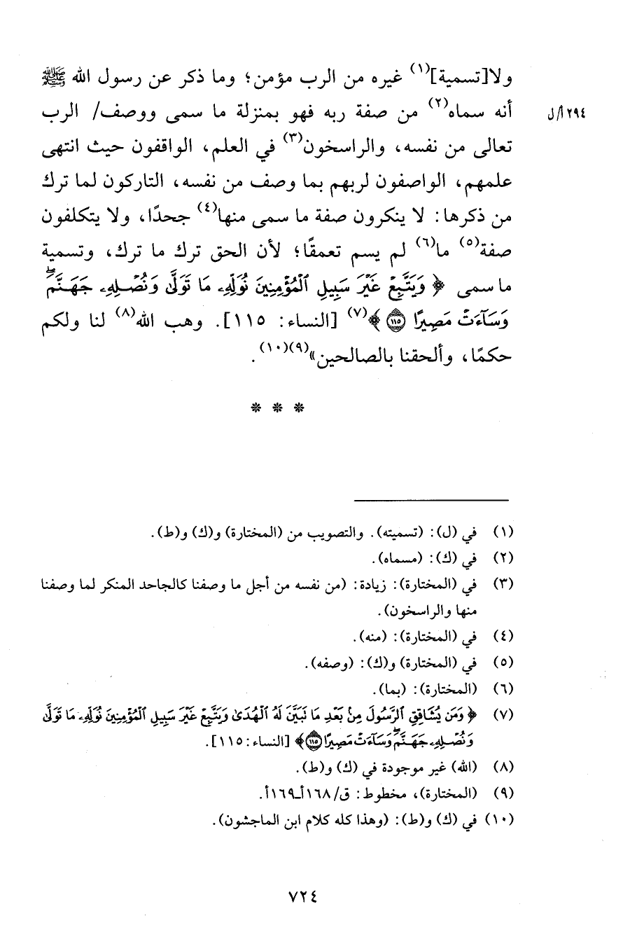 ولاتسمية غيره من الرب مؤمن وما ذكر عن رسول الله صلى الله عليه وسلم أنه سماه من صفة ربه فهو بمنزلة ما سمى ووصف الرب تعالى من نفسه والراسخون في العلم الواقفون حيث انتهى علمهم الواصفون لربهم بما وصف من نفسه التاركون لما ترك من ذكرها لا ينكرون صفة ما سمى منها جحدًا ولا يتكلفون صفة ما لم يسم تعمقًا لأن الحق ترك ما ترك وتسمية ما سمى وَيَتَّبِعْ غَيْرَ سَبِيلِ الْمُؤْمِنِينَ نُوَلِّهِ مَا تَوَلَّى وَنُصْلِهِ جَهَنَّمَ وَسَاءتْ مَصِيراً {115} [النساء 115] وهب الله لنا ولكم حكمًا وألحقنا بالصالحين
