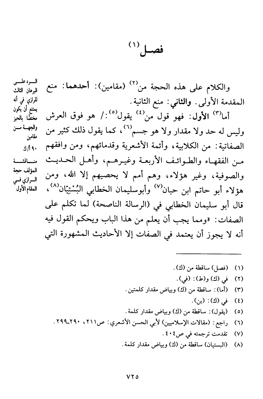 فصل والكلام على هذه الحجة من مقامين أحدهما منع المقدمة الأولى والثاني منع الثانية أما الأول فهو قول من يقول هو فوق العرش وليس له حد ولا مقدار ولا هو جسم كما يقول ذلك كثير من الصفاتية من الكلابية وأئمة الأشعرية وقدمائهم ومن وافقهم من الفقهاء والطوائف الأربعة وغيرهم وأهل الحديث والصوفية وغير هؤلاء وهم أمم لا يحصيهم إلا الله ومن هؤلاء أبو حاتم ابن حبان وأبوسليمان الخطابي البُسْتِيّان قال أبو سليمان الخطابي في الرسالة الناصحة لما تكلم على الصفات ومما يجب أن يعلم من هذا الباب ويحكم القول فيه أنه لا يجوز أن يعتمد في الصفات إلا الأحاديث المشهورة التي