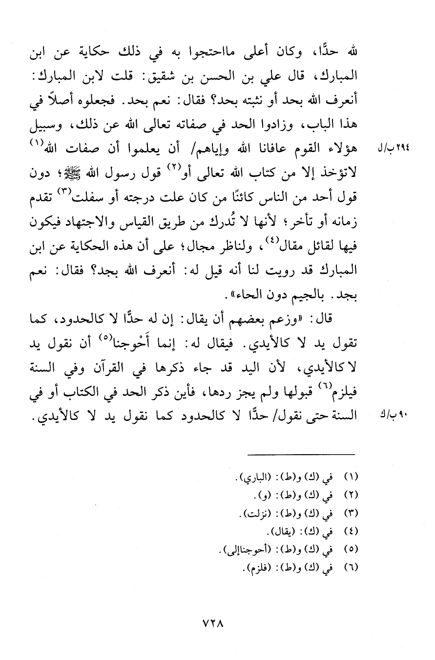 لله حدًّا وكان أعلى مااحتجوا به في ذلك حكاية عن ابن المبارك قال علي بن الحسن بن شقيق قلت لابن المبارك أنعرف الله بحد أو نثبته بحد فقال نعم بحد فجعلوه أصلاً في هذا الباب وزادوا الحد في صفاته تعالى الله عن ذلك وسبيل هؤلاء القوم عافانا الله وإياهم أن يعلموا أن صفات الله لاتؤخذ إلا من كتاب الله تعالى أو قول رسول الله صلى الله عليه وسلم دون قول أحد من الناس كائنًا من كان علت درجته أو سفلت تقدم زمانه أو تأخر لأنها لا تُدرك من طريق القياس والاجتهاد فيكون فيها لقائل مقال ولناظر مجال على أن هذه الحكاية عن ابن المبارك قد رويت لنا أنه قيل له أنعرف الله بجد فقال نعم بجد بالجيم دون الحاء قال وزعم بعضهم أن يقال إن له حدًّا لا كالحدود كما تقول يد لا كالأيدي فيقال له إنما أَحْوجنا أن نقول يد لا كالأيدي لأن اليد قد جاء ذكرها في القرآن وفي السنة فيلزم قبولها ولم يجز ردها فأين ذكر الحد في الكتاب أو في السنة حتى نقول حدًّا لا كالحدود كما نقول يد لا كالأيدي