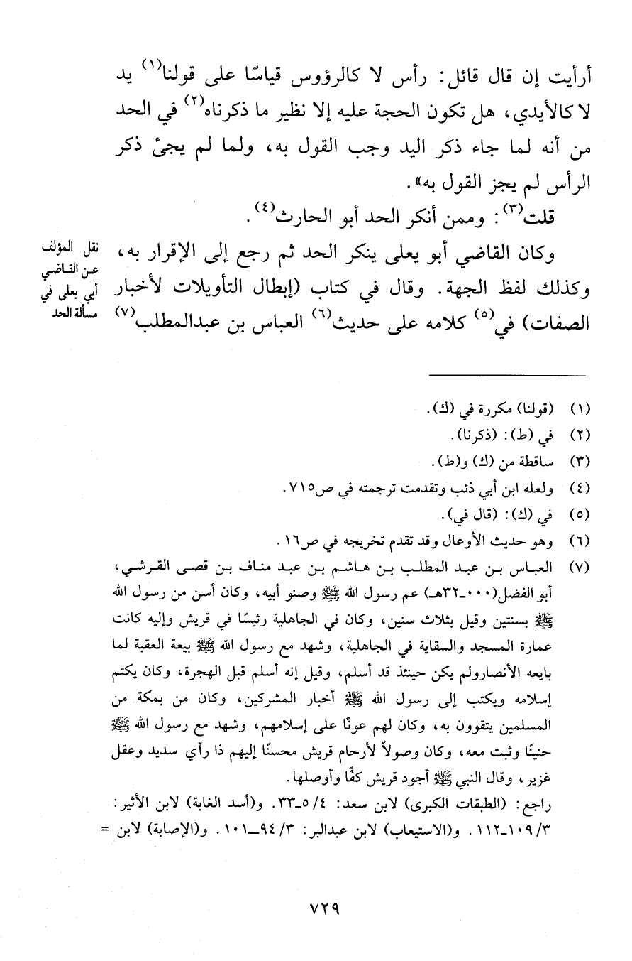 أرأيت إن قال قائل رأس لا كالرؤوس قياسًا على قولنا يد لا كالأيدي هل تكون الحجة عليه إلا نظير ما ذكرناه في الحد من أنه لما جاء ذكر اليد وجب القول به ولما لم يجئ ذكر الر أس لم يجز القول به قلت وممن أنكر الحد أبو الحارث وكان القاضي أبو يعلى ينكر الحد ثم رجع إلى الإقرار به وكذلك لفظ الجهة وقال في كتاب إبطال التأويلات لأخبار الصفات في كلامه على حديث العباس بن عبد المطلب