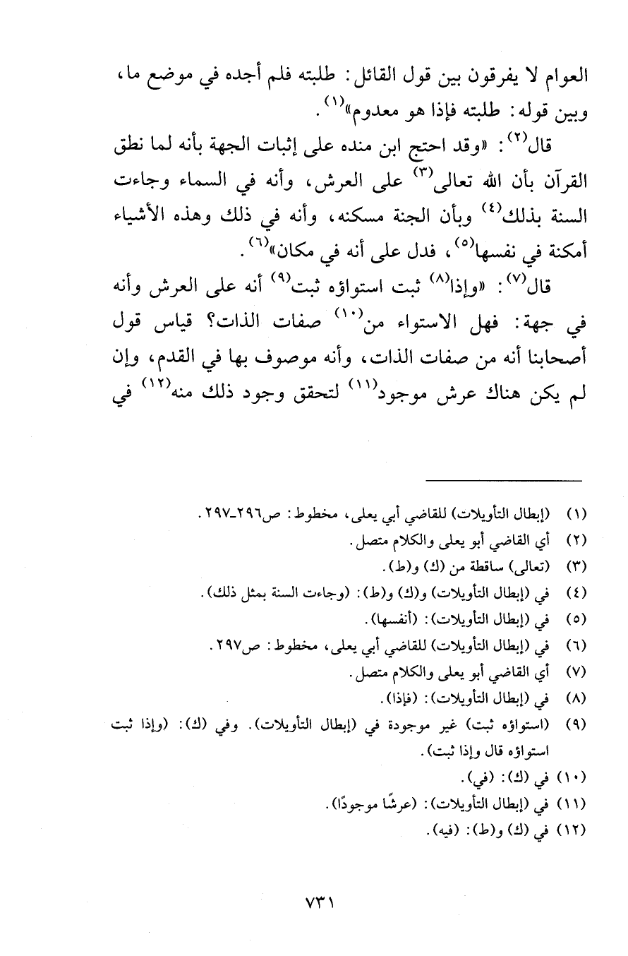 العوام لا يفرقون بين قول القائل طلبته فلم أجده في موضع ما وبين قوله طلبته فإذا هو معدوم قال وقد احتج ابن منده على إثبات الجهة بأنه لما نطق القرآن بأن الله تعالى على العرش وأنه في السماء وجاءت السنة بذلك وبأن الجنة مسكنه وأنه في ذلك وهذه الأشياء أمكنة في نفسها فدل على أنه في مكان قال وإذا ثبت استواؤه ثبت أنه على العرش وأنه في جهة فهل الاستواء من صفات الذات قياس قول أصحابنا أنه من صفات الذات وأنه موصوف بها في القدم وإن لم يكن هناك عرش موجود لتحقق وجود ذلك منه في