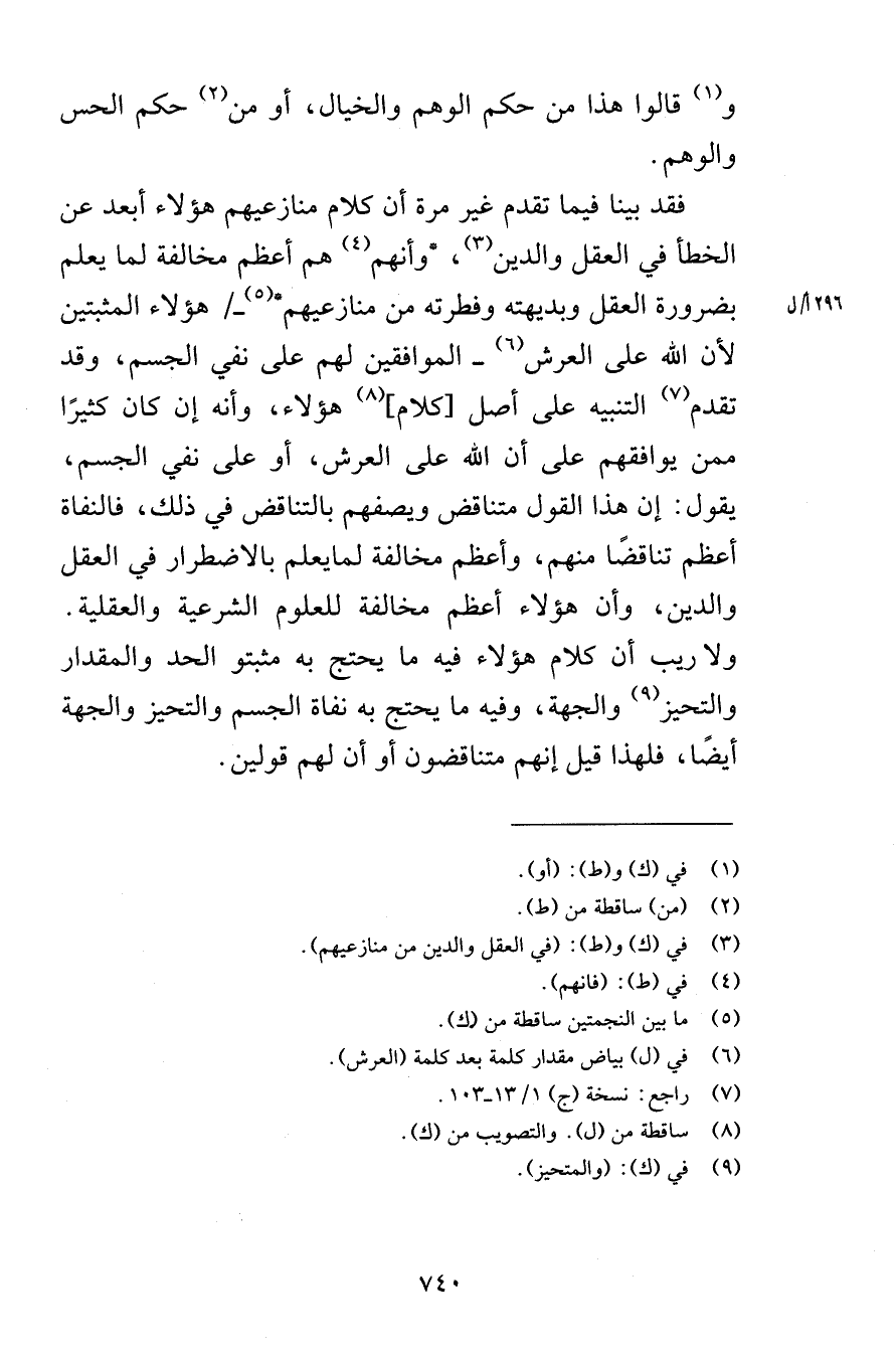 وقالوا هذا من حكم الوهم والخيال أو من حكم الحس والوهم فقد بينا فيما تقدم غير مرة أن كلام منازعيهم هؤلاء أبعد عن الخطأ في العقل والدين وأنهم هم أعظم مخالفة لما يعلم بضرورة العقل وبديهته وفطرته من منازعيهم هؤلاء المثبتين لأن الله على العرش الموافقين لهم على نفي الجسم وقد تقدم التنبيه على أصل كلام هؤلاء وأنه إن كان كثيرًا ممن يوافقهم على أن الله على العرش أو على نفي الجسم يقول إن هذا القول متناقض ويصفهم بالتناقض في ذلك فالنفاة أعظم تناقضًا منهم وأعظم مخالفة لمايعلم بالاضطرار في العقل والدين وأن هؤلاء أعظم مخالفة للعلوم الشرعية والعقلية ولا ريب أن كلام هؤلاء فيه ما يحتج به مثبتو الحد والمقدار والتحيز والجهة وفيه ما يحتج به نفاة الجسم والتحيز والجهة أيضًا فلهذا قيل إنهم متناقضون أو أن لهم قولين