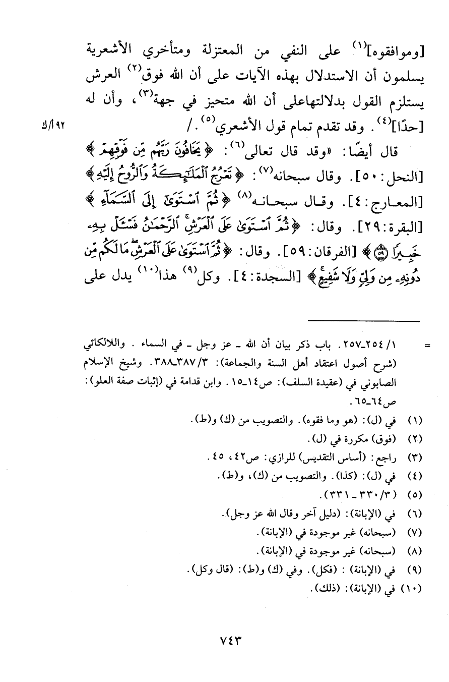 وموافقوه على النفي من المعتزلة ومتأخري الأشعرية يسلمون أن الاستدلال بهذه الآيات على أن الله فوق العرش يستلزم القول بدلالتهاعلى أن الله متحيز في جهة وأن له حدًا وقد تقدم تمام قول الأشعري قال أيضًا وقد قال تعالى يَخَافُونَ رَبَّهُم مِّن فَوْقِهِمْ [النحل 50] وقال سبحانه تَعْرُجُ الْمَلَائِكَةُ وَالرُّوحُ إِلَيْهِ [المعارج 4] وقال سبحانه ثُمَّ اسْتَوَى إِلَى السَّمَاء [البقرة 29] وقال ثُمَّ اسْتَوَى عَلَى الْعَرْشِ الرَّحْمَنُ فَاسْأَلْ بِهِ خَبِيراً {59} [الفرقان 59] وقال ثُمَّ اسْتَوَى عَلَى الْعَرْشِ مَا لَكُم مِّن دُونِهِ مِن وَلِيٍّ وَلَا شَفِيعٍ [السجدة 4] وكل هذا يدل على