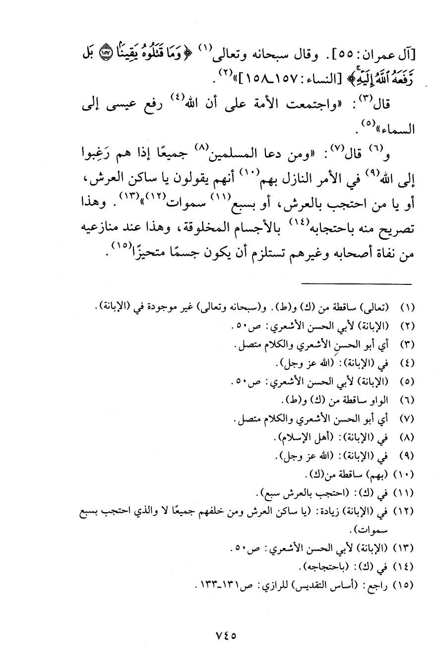 [آل عمران 55] وقال سبحانه وتعالى وَمَا قَتَلُوهُ يَقِيناً {157} بَل رَّفَعَهُ اللهُ إِلَيْهِ [النساء 157-158] قال واجتمعت الأمة على أن الله رفع عيسى إلى السماء وقال ومن دعا المسلمين جميعًا إذا هو رَغِبوا إلى الله في الأمر النازل بهم أنهم يقولون يا ساكن العرش أو يا من احتجب بالعرش أو بسبع سموات وهذا تصريح منه باحتجابه بالأجسام المخلوقة وهذا عند منازعيه من نفاة أصحابه وغيرهم تستلزم أن يكون جسمًا متحيزًا
