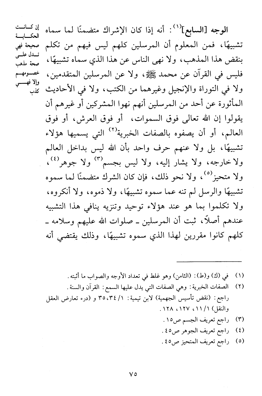 الوجه السابع أنه إذا كان الإشراك متضمنًا لما سماه تشبيهًا فمن المعلوم أن المرسلين كلهم ليس فيهم من تكلم بنقض هذا المذهب ولا نهى الناس عن هذا الذي سماه تشبيهًا فليس في القرآن عن محمد صلى الله عليه وسلم ولا عن المرسلين المتقدمين ولا في التوراة والإنجيل وغيرهما من الكتب ولا في الأحاديث المأثورة عن أحد من المرسلين أنهم نهوا المشركين أو غيرهم أن يقولوا إن الله تعالى فوق السموات أو فوق العرش أو فوق العالم أو أن يصفوه بالصفات الخبرية التي يسميها هؤلاء تشبيهًا ولا ذموه ولا أنكروه ولا تكلموا بما هو عند هؤلاء توحيد وتنزيه ينافي هذا التشبيه عندهم أصلاً ثبت أن المرسلين صلوات الله عليهم وسلامه كلهم كانوا مقررين لهذا الذي سموه تشبيهًا وذلك يقتضي أنه
